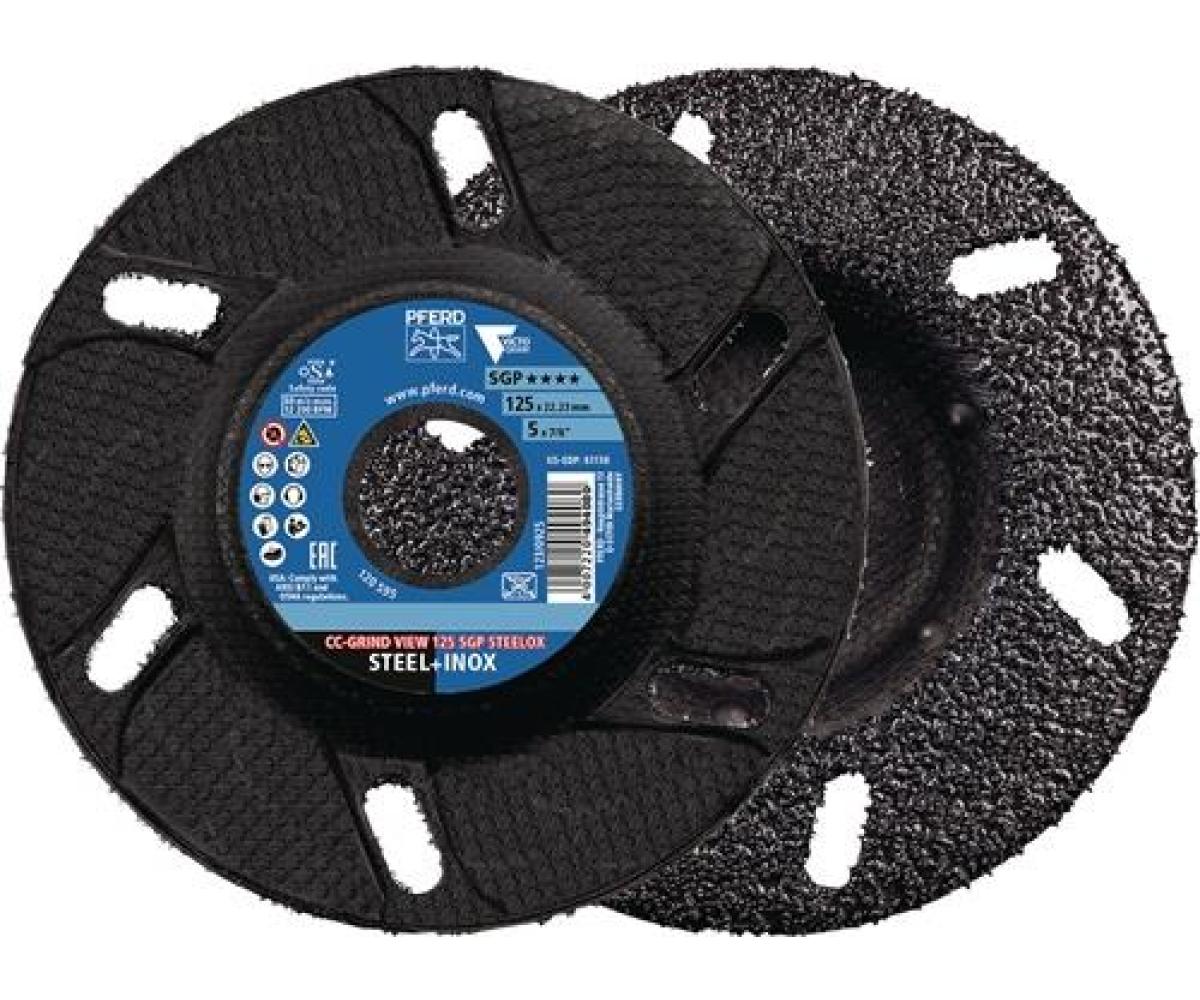 Aggressivität für schnellsten Arbeitsfortschritt · glasfaserverstärkter Kunststofftragteller garantiert einen ebenso robusten und sicheren Einsatz · deutlich ergonomischer als eine Schruppscheibe: Lärm, Vibrationen und Staub werden signifikant reduziert · gegenüber Fächerscheiben können durch die Formstabilität plane Oberflächen erzielt werden · anders als Fiberschleifer verformt sich die CC-GRIND VIEW auch unter extremen klimatischen Bedingungen nicht und ist deutlich robuster im rauen Einsatz · dank der angepassten Geometrie ist die Verwendung eines Sonderspannflanschsets nicht notwendig · für Einsatzstähle, Edelstahl (INOX), Stahl, Werkzeugstähle, Holz · Anwendungen: Anfasen, Entgraten, Stufenweises Feinschleifen, Egalisieren, Flächenschliff, Flächenbearbeitung, Schweißnahtbearbeitung, Kantenbearbeitung, Kantenbearbeitung (Anfasen, Verrunden) · Antriebsarten: Winkelschleifer, Akkuwinkelschleifer, Roboter · Bohrung 22,23 mm Ø
