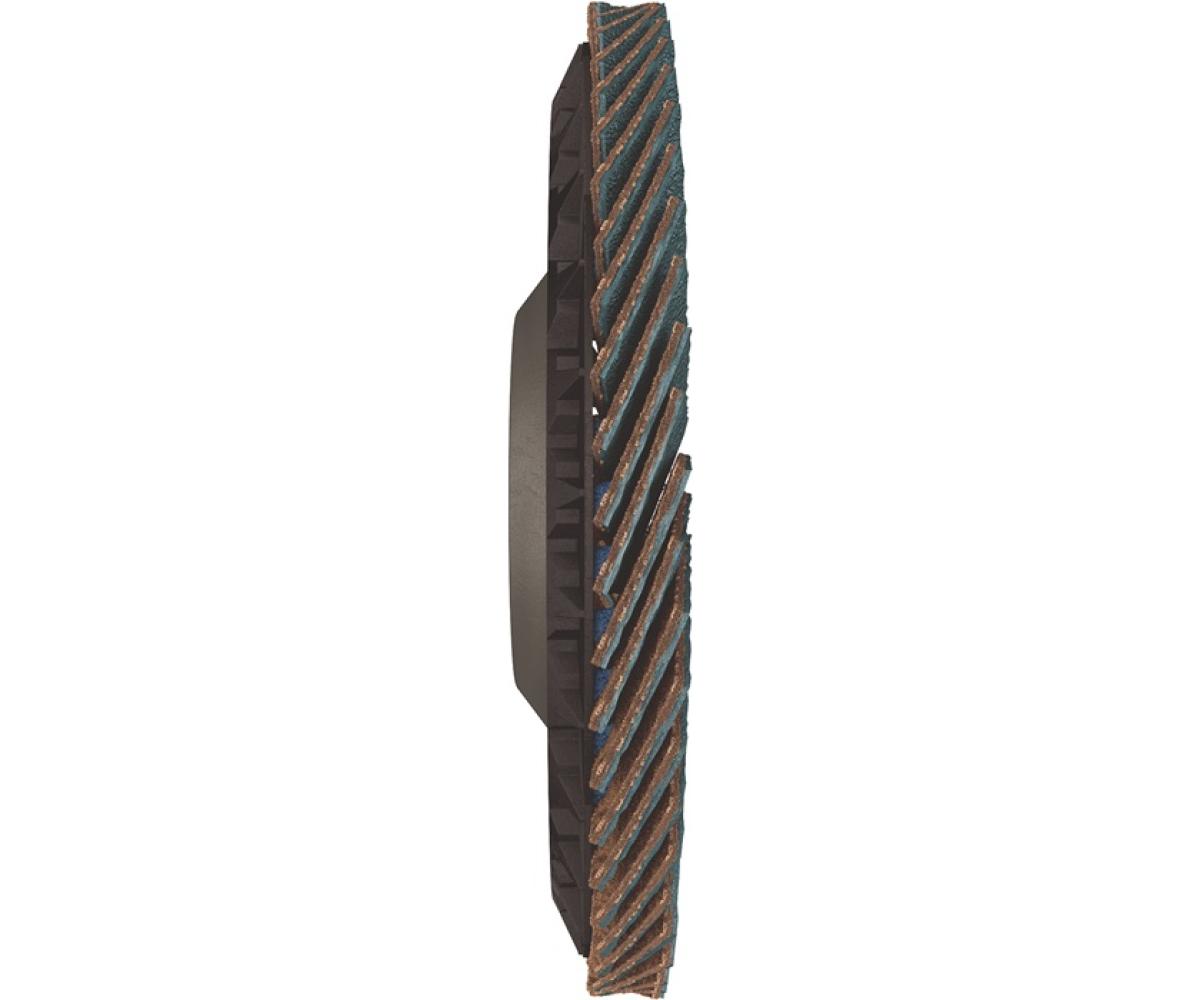 Fächerscheibe mit erhöhter Lamellendichte für eine maximale Standzeit · höchste Abtragsleistung dank Hightech-Zirkon-Lamellen · trimmbarer Kunststoffträgerkörper, der eine vollständige Nutzung der Lamellen garantiert · speziell für den Kanten- und Flächenschliff und zur Bearbeitung von Schweißnähten einsetzbar · Bohrung 22,23 mm Ø