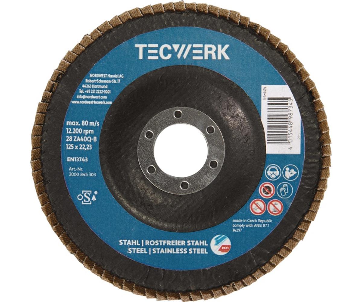 Weitere technische Eigenschaften · Bohrung: 22,23mm · Premium Fächerscheibe · 2in1 D.125mm K.80 · fl.INOX/Stahl ZK TECWERK ·