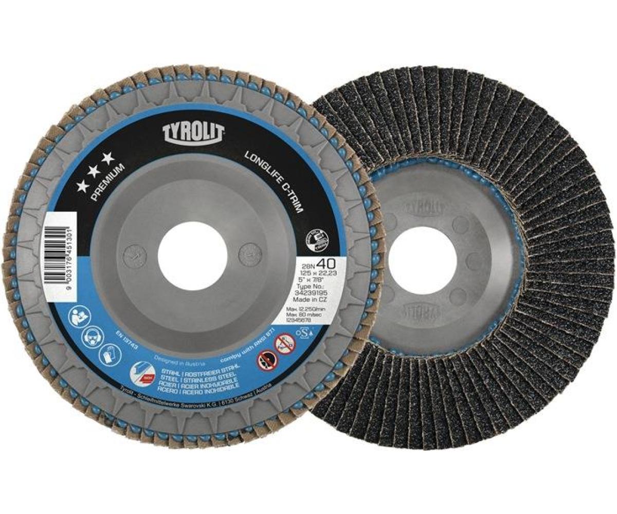 Premium-Fächerscheibe C-TRIM mit höchster Lebensdauer und exzellenter Abtragsleistung · durch den Kunststoffkörper ist die Scheibe trimmbar · verdichtetes Leinen am Rand der Scheibe sorgt für eine hohe Stabilität beim Kantenschleifen und daher länger nutzbar · geeignet zur Schweißnahtbearbeitung sowie Kanten- und Flächenschliff · Bohrung 22,23 mm Ø