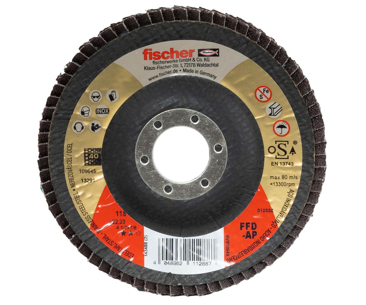 Die fischer Lamellenschleifscheibe FFD-AP ist eine leistungsstarke Zirkon-Fächerschleifscheibe für das Bearbeiten von Stahl und Edelstahl. Das selbstschärfende Zirkonkorund-Schleifkorn in Verbindung mit der optimierten Bindungsmatrix garantiert eine lange Lebensdauer bei hoher Zerspanungsleistung.