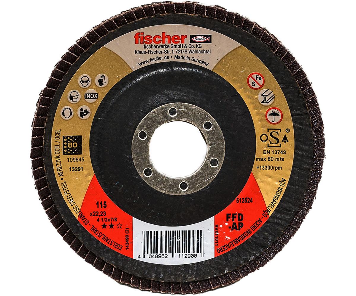 Die fischer Lamellenschleifscheibe FFD-AP ist eine leistungsstarke Zirkon-Fächerschleifscheibe für das Bearbeiten von Stahl und Edelstahl. Das selbstschärfende Zirkonkorund-Schleifkorn in Verbindung mit der optimierten Bindungsmatrix garantiert eine lange Lebensdauer bei hoher Zerspanungsleistung.