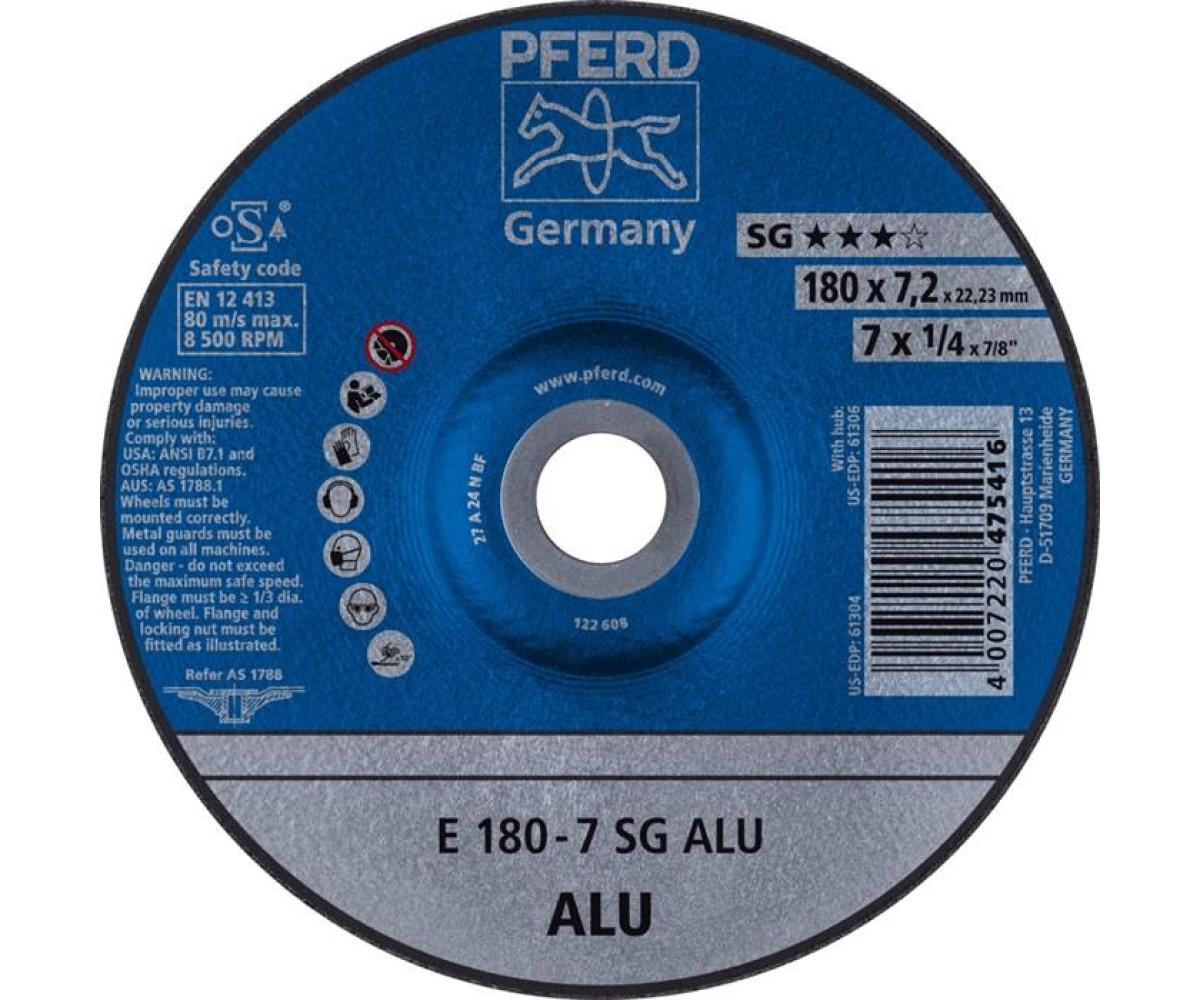 Weitere technische Eigenschaften · Antriebsart: Winkelschleifer · Bearbeitbare Werkstoffe: Aluminium, Weitere NE-Metalle · Bearbeitungsaufgaben: Entgraten, Anfasen, Ausfugen, Flächenschliff, Schweißnahtbearbeitung, Kehlnahtbearbeitung · Breite: 7,2mm · Schleifmittel: Korund A und Siliciumcarbid SiC/C · Vorteile: Enthält keine Füllstoffe, die unerwünschte Rückstände auf dem Werkstück hinterlassen. Damit ist die Oberfläche direkt schweißbar. Kein Zusetzen der Schruppscheibe auch auf weichen, schmierenden Werkstoffen. Schneller Arbeitsfortschritt und höchste Wirtschaftlichkeit durch hohe Schleiffreudigkeit. Weniger Werkzeugwechsel durch sehr gute Standzeit. · Schruppscheibe SG ALU · D180xS7,2mm · gekr.Alu.Bohr.22,23mm ·