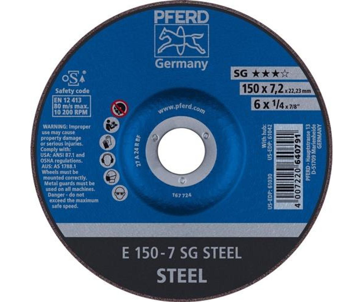 Weitere technische Eigenschaften · Antriebsart: Winkelschleifer · Aufnahmesystem: Bohrung · Bearbeitbare Werkstoffe: Stahl · Bearbeitungsaufgaben: Anfasen, Schweißnahtbearbeitung, Flächenschliff, Ausfugen, Entgraten, Kehlnahtbearbeitung · Breite: 7,2mm · Schleifmittel: Korund A · Vorteile: Weniger Werkzeugwechsel durch sehr gute Standzeit. Schneller Arbeitsfortschritt und höchste Wirtschaftlichkeit durch hohe Schleiffreudigkeit. · Schruppscheibe SG STEEL · D150xS7,2mm gekr.STA · Bohr.22,23mm PFERD ·