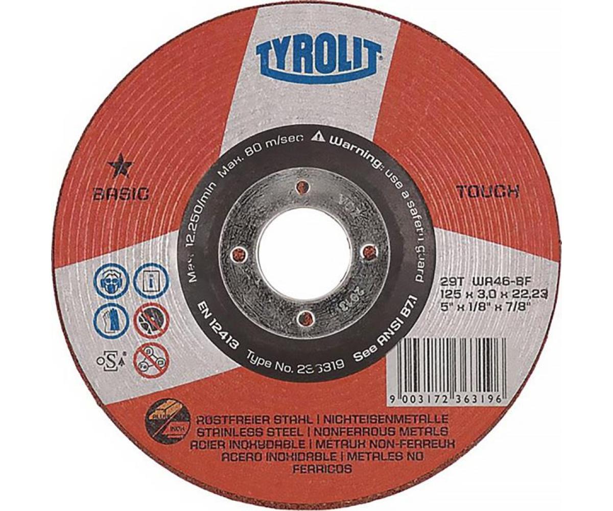 Weitere technische Eigenschaften · Bohrung: 22,23mm · D x U x H: 125 x 3 x 22,23mm · Form: 27 T gekröpfte Schleifscheibe · Produktlinie: BASIC · Vs /max: 72m/s · Werkstoffeignung: Rostfreier Stahl, Aluminium · Schruppscheibe BASIC · TOUCH D125xS3mmKörnung 46 · gekr.TYROLIT ·