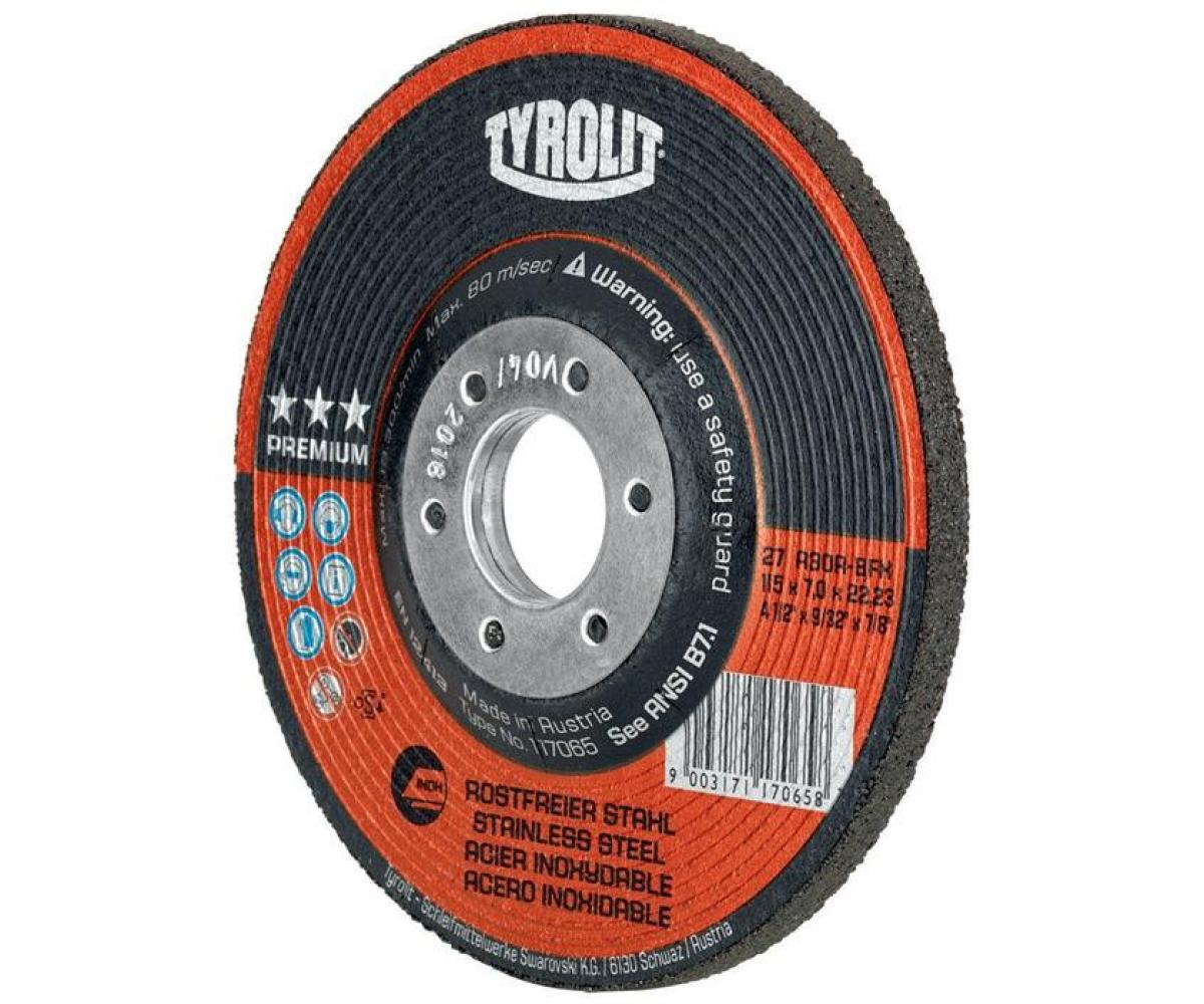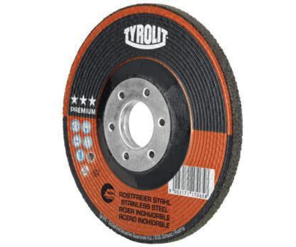 Weitere technische Eigenschaften · D x U x H: 125 x 4 x 22,23mm · Nettogewicht: 0,108kg · Produktlinie: PREMIUM · Spezifikation: A 30 R- BFX · Vs /max: 72m/s · Werkstoffeignung: Rostfreier Stahl · Schruppscheibe PREMIUM · D125xS4mmKörnung 30 · gekr.Bohr.22,23mm TYROLIT ·