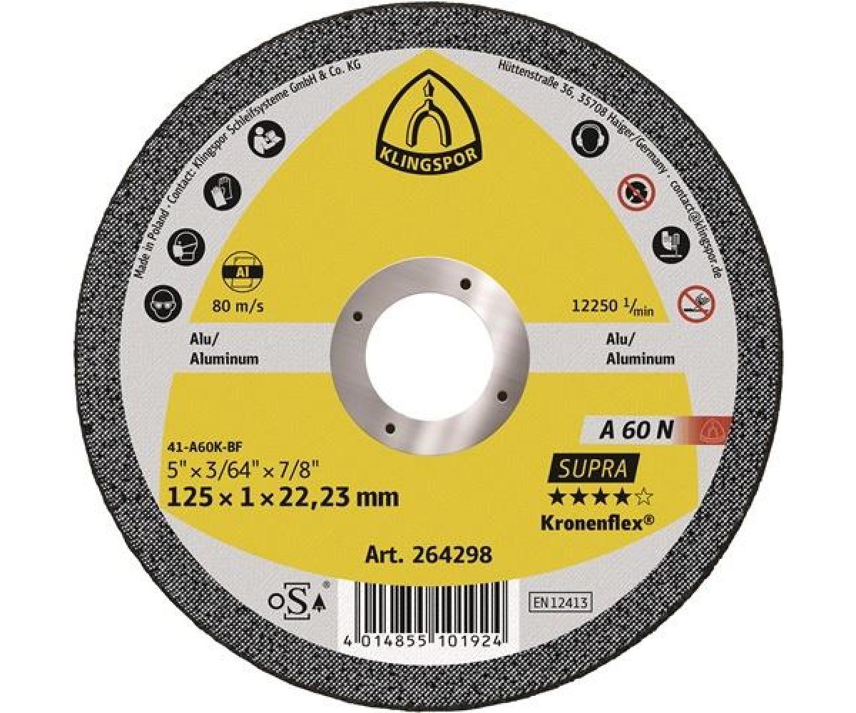 Weitere technische Eigenschaften · Anwendungsgebiet: Aluminium · Höchstgeschwindigkeit: 80m/s · Nutzungsart: Winkelschleifer · Trennscheibe A 60N Supra · D125x1mm · ger.Alu.Bohr.22,23mm ·