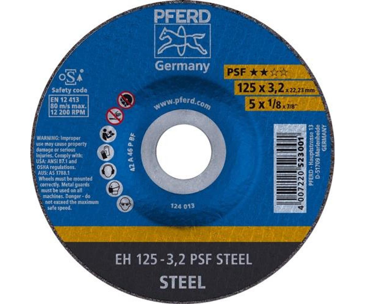 Weitere technische Eigenschaften · Antriebsart: Winkelschleifer · Bearbeitungsaufgaben: Trennen von Profilen, Trennen von Blechen, Trennen von Vollmaterial, Erzeugen von Durchbrüchen · Vorteile: Schneller Arbeitsfortschritt durch hohe Trennleistung. Hohe Wirtschaftlichkeit durch gute Standzeit. · Trennscheibe PSF STEEL · D125x3,2mm gekr.STA · Bohr.22,23mm PFERD ·