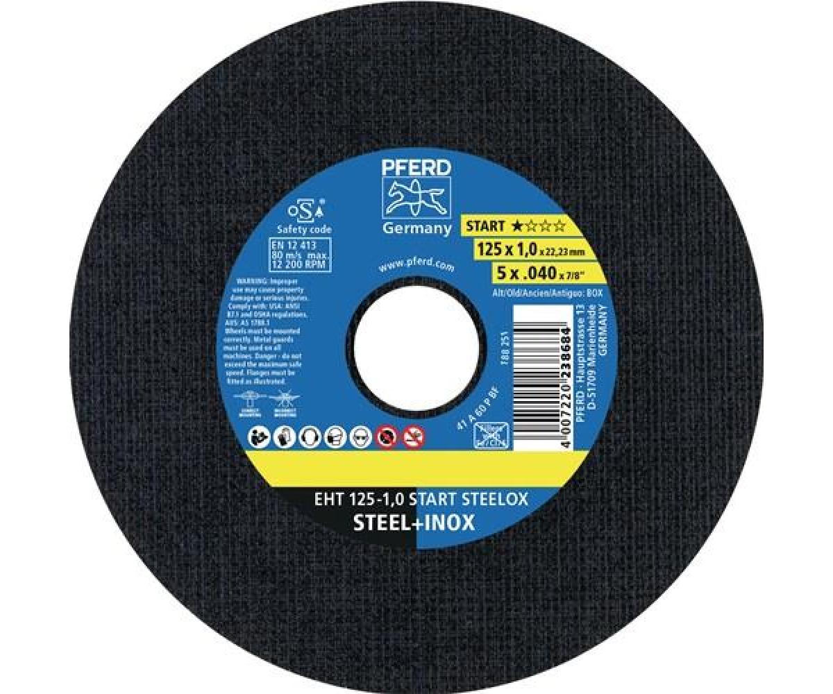 universell auf Edelstahl (INOX) und Stahl einsetzbar · mit hoher Trennleistung und solider Standzeit · zum Trennen von Blechen, Profilen und Vollmaterial, Erzeugen von Durchbrüchen · Box á 50 Stück · Bohrung 22,23 mm Ø