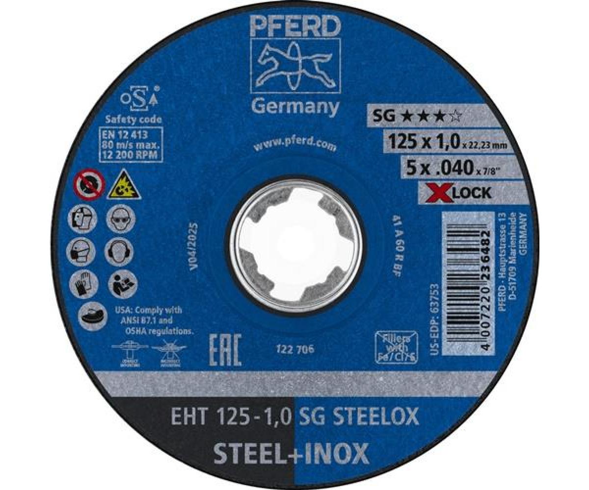 Weitere technische Eigenschaften · Antriebsart: Winkelschleifer · Anwendungsempfehlung: Setzen Sie das Werkzeug auf das X-LOCK-Spannsystem Ihres Winkelschleifers und fixieren Sie es, indem Sie es leicht nach unten drücken. Das Werkzeug rastet hörbar ein. Lösen Sie das Werkzeug durch Betätigen des Hebels. · Aufnahmesystem: X-LOCK · Bearbeitungsaufgaben: Trennen von Vollmaterial, Trennen von Blechen, Trennen von Profilen, Erzeugen von Durchbrüchen · Hinweis: PFERDEFFICIENCY empfiehlt dünne Trennscheiben für perfekte Ergebnisse in kürzester Zeit. PFERDERGONOMICS empfiehlt dünne Trennscheiben, um die beim Einsatz entstehende Vibrations-, Lärm- und Staubentwicklung nachhaltig zu senken und den Arbeitskomfort zu verbessern. · Vorteile: Schnelle Trennschnitte. Trennscheiben mit X-LOCK können auch auf herkömmlichen Winkelschleifern mit Gewinde M14 und 5/8”-11 eingesetzt werden. Sichere Fixierung durch hörbares Einrasten des Werkzeuges. Universell auf Stahl und Edelstahl (INOX) einsetzbar. Komfortabel und sicher. Dünne und gratarme Trennschnitte. Mit X-LOCK-Aufnahme für komfortable und schnelle Werkzeugwechsel. Schneller Arbeitsfortschritt durch hohe Trennleistung. Höchste Wirtschaftlichkeit durch höchste Standzeit. · Trennscheibe X-LOCK SG · STEELOX D125x1mm · ger.PFERD ·