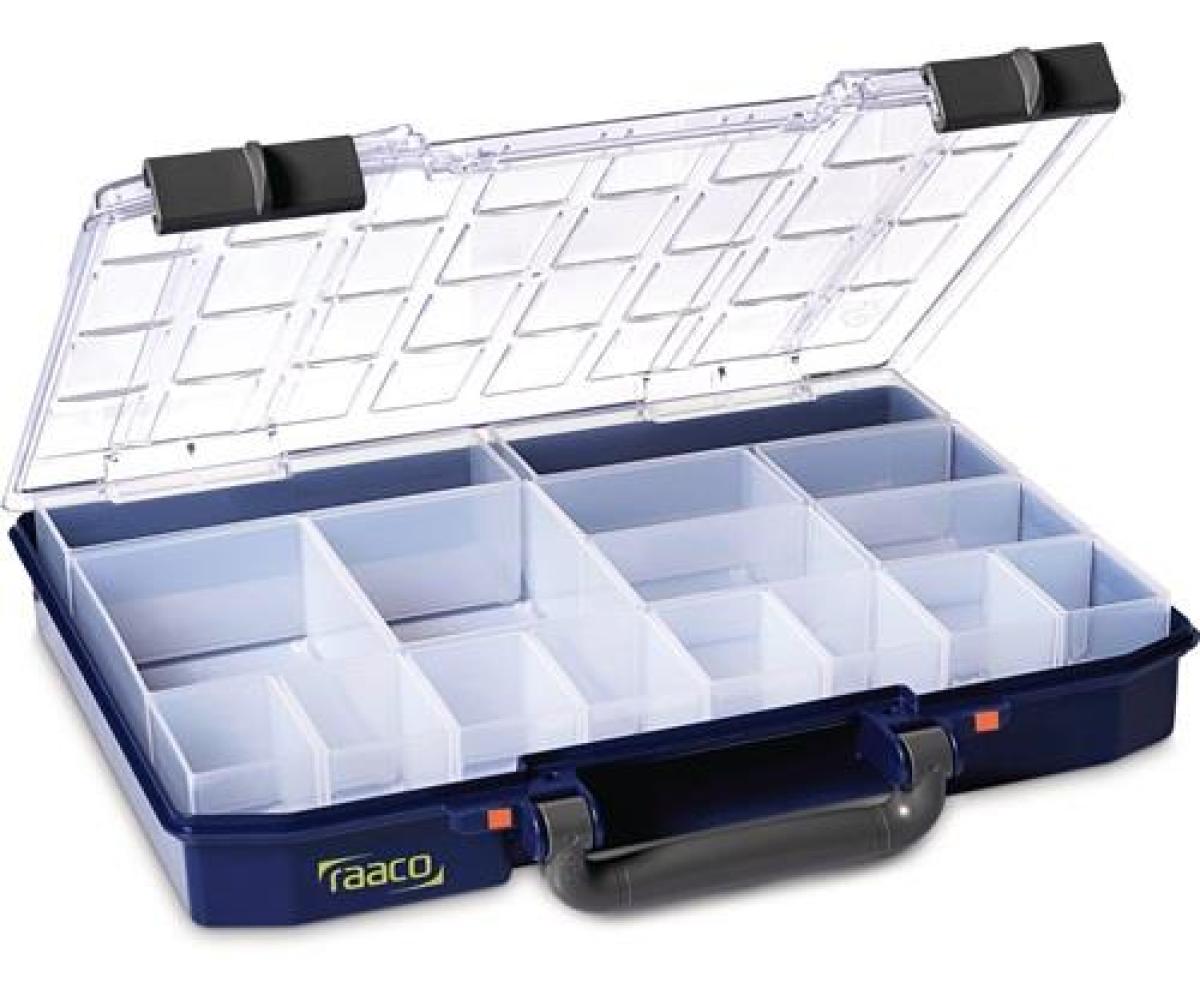 aus schlagfestem Polypropylen / Polycarbonat · kein Verbeulen · kein Rosten · keine scharfen Kanten und Ecken · der Deckel aus unzerbrechlichem Polycarbonat hat ein Raster auf der Innenseite, das das Verrutschen kleinster Teile verhindert · mit ergonomischem Tragegriff · mit herausnehmbaren Fach-Einsätzen
