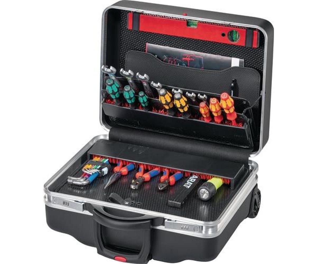 Doppel-Aluminiumrahmen · robuste, rutschfeste X-ABS Außenschale · bis zu 60 Werkzeuge lassen sich in zwei Werkzeugtafeln sicher verstauen · frei unterteilbare, mit 88 mm extratiefe Bodenschale · mit Wasserwaagen-Halterung sowie Visitenkartenfächer, Stiftschlaufen und Dokumentenfach im Kofferdeckel · bis zu 30 kg belastbar · 4-fach-Teleskopauszug · große Leichtlaufrollen · Rasterscharniere mit praktischer Kofferdeckelarretierung mit Zahlenschloss