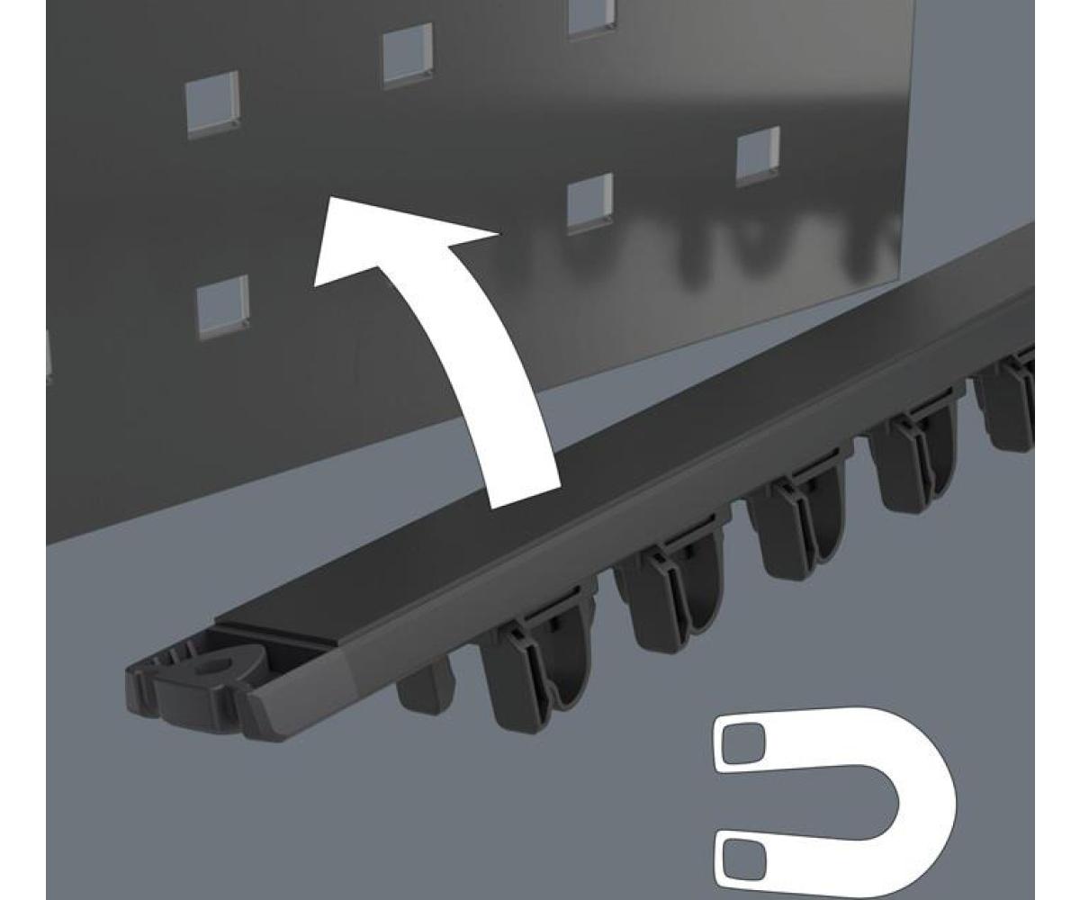 unbestückt · für bis zu 9 Kraftform Schraubendreher · die Klemmen der Leiste sorgen für perfekten Halt und leichte Entnahme der Werkzeuge · Leiste hält durch starken Magnet sicher an Metallflächen, alternativ kann die Leiste auch an eine Wand geschraubt werden