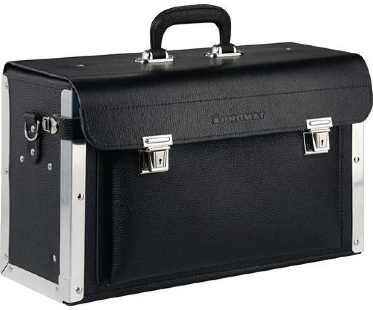mit aufklappbarer Vorderwand · Material: Echtleder · Innenmaße: 420 x 150 x 250 mm · Alu-Kantenschutz · 18 verstellbare Werkzeughalterungen · 2 Schlaufen an den Seitenwänden · Innenraum komplett verstärkt · verzinkte Stahlblechbodenwanne · 2 Steckschlösser · Bodengleiter · Trageringe · große Vordertasche · Lieferung ohne Trageriemen