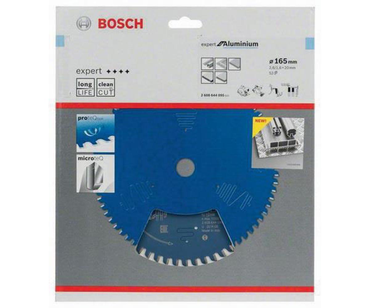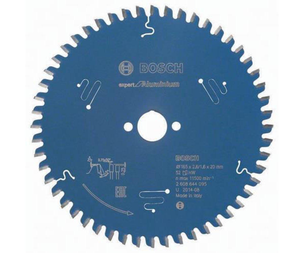 Kreissägeblatt Expert for Aluminium für Tauch- und Handkreissägen. Außendurchmesser: 165 mm · Bohrung: 20 mm · Schnittbreite: 2,6 mm · Stammblattstärke: 1,6 mm · Zähnezahl: 52. Für saubere Schnitte in Nichteisenmetalle wie Aluminium. Auch geeignet zum Schneiden von Kunststoffen und Epoxy · rohen Spanplatten · Akustikplatten · Leichtbauplatten · abrasive ein- oder zweiseitig beschichtete Plattenwerkstoffe sowie Faserwerkstoffe wie MDF- und OSB-Platten. Zähne aus Microteq für hohe Lebensdauer. Die Verwendung des Universalschneidöls 2 607 001 409 erhöht die Standzeit bei Schnitten in Metall · z. B. Aluminium · um ein Mehrfaches.
