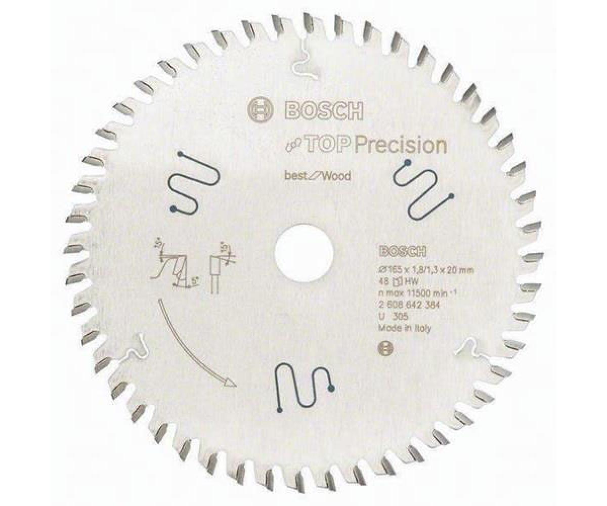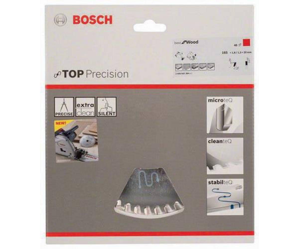 Kreissägeblatt Top Precision Best for Wood für Tauch- und Handkreissägen · Außendurchmesser: 165 mm · Bohrung: 20 mm · Schnittbreite: 1,8 mm · Zähnezahl: 48 · für präzise · saubere und leise Schnitte in allen Holzarten mit Tauch- und Handkreissägen · Zähne aus Microteq · Hartmetallzähne aus besonders dichtem Hartmetallpulver mit mikrofeiner Körnung minimieren die Abnutzung der Schneide für beste Schnittqualität und hohe Lebensdauer · Beschichtung Cleanteq: verringert das Anhaften von Rückständen (Harz · Leim) · Vibrationsminderung mit Stabilteq: Vibrationen und Geräuschentwicklung werden stark verringert · mit lasergeschnittenen Dehnungsschlitzen für hohe Blattstabilität und Genauigkeit · erstklassiger Stahl (bis HRC 46) für hohe Haltbarkeit · dank dem speziell eingerollten Spannungsring bleiben die Blätter auch im Einsatz formstabil und eben