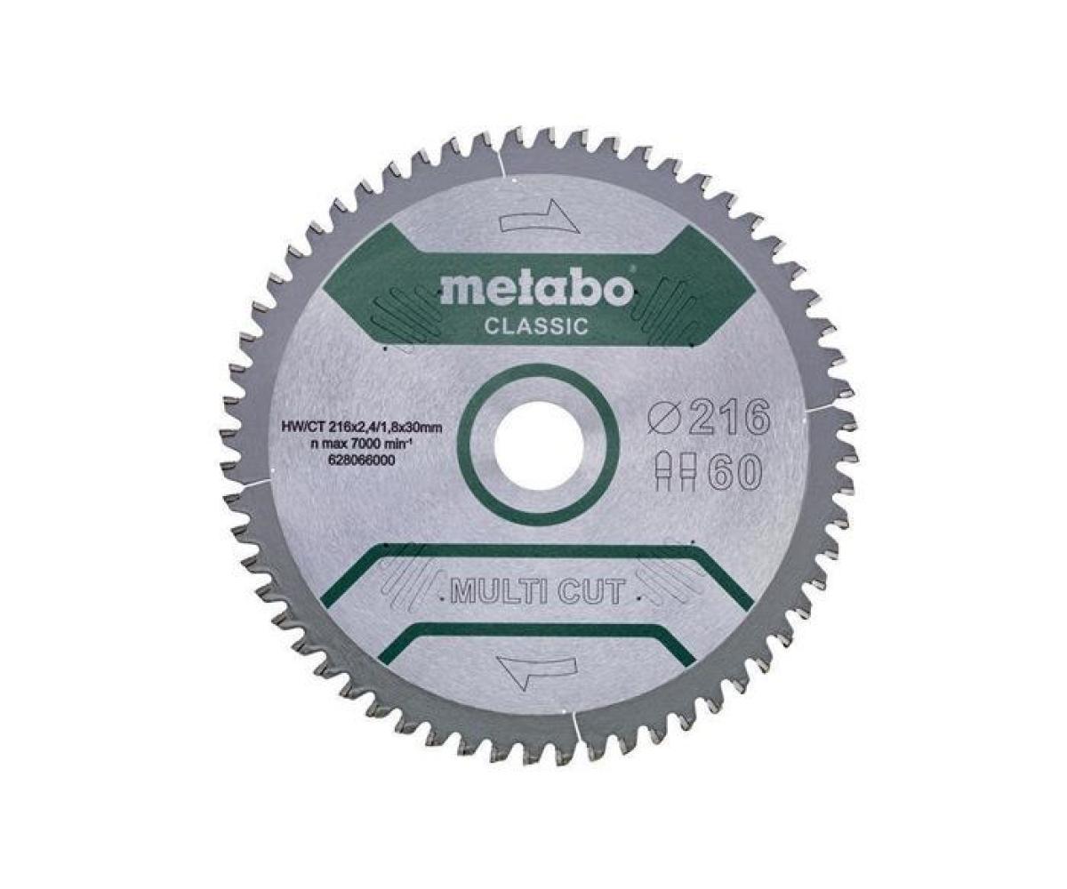 Weitere technische Eigenschaften · Durchmesser x Schnittbreite x Bohrung: 216mm · geeignet für: KGSV 216 M / KS 216 M Lasercut / KGS 216 M / KGSV 72 Xact / KGSV 72 Xact SYM · Spanwinkel: 5° neg. · Stammblattdicke: 1,8mm · Verpackung: Karton · Kreissägeblatt multi cut · classic D216xDicke 2,4xBo · hrung30mm Z.60 HW/CT FZ/T ·