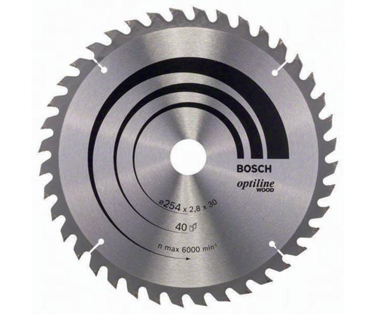 Kreissägeblatt Optiline Wood für Kapp- und Gehrungssägen. Außendurchmesser: 254 mm · Bohrung: 30 mm · Schnittbreite: 2,8 mm · Zähnezahl: 40. Das präzise Blatt für den Qualitätsschnitt in allen Holzarten.
