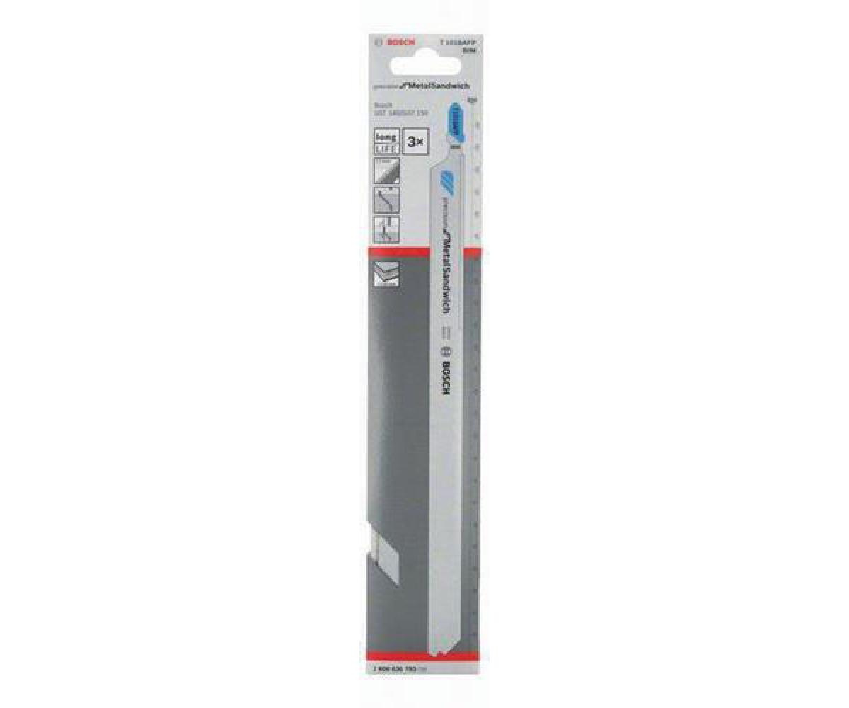 zum präzisen, sauberen geraden Schneiden in Metall · ermöglicht präzise, winkelhaltige Schnitte, während die gefrästen, gewellten Zähne zum Schneiden von Metall-Sandwich-Paneelen konzipiert sind · das Blatt ist mit einer sehr feinen Zahnteilung (1,1 mm) und einer besonders großen Länge (250 mm) ausgestattet, um Sandwichmaterialien (bis 160 mm Dicke) zu schneiden · für den Gebrauch mit Stichsägen mit T-Schaft-Aufnahme · Inhalt der Verkaufspackung: 3 Stück
