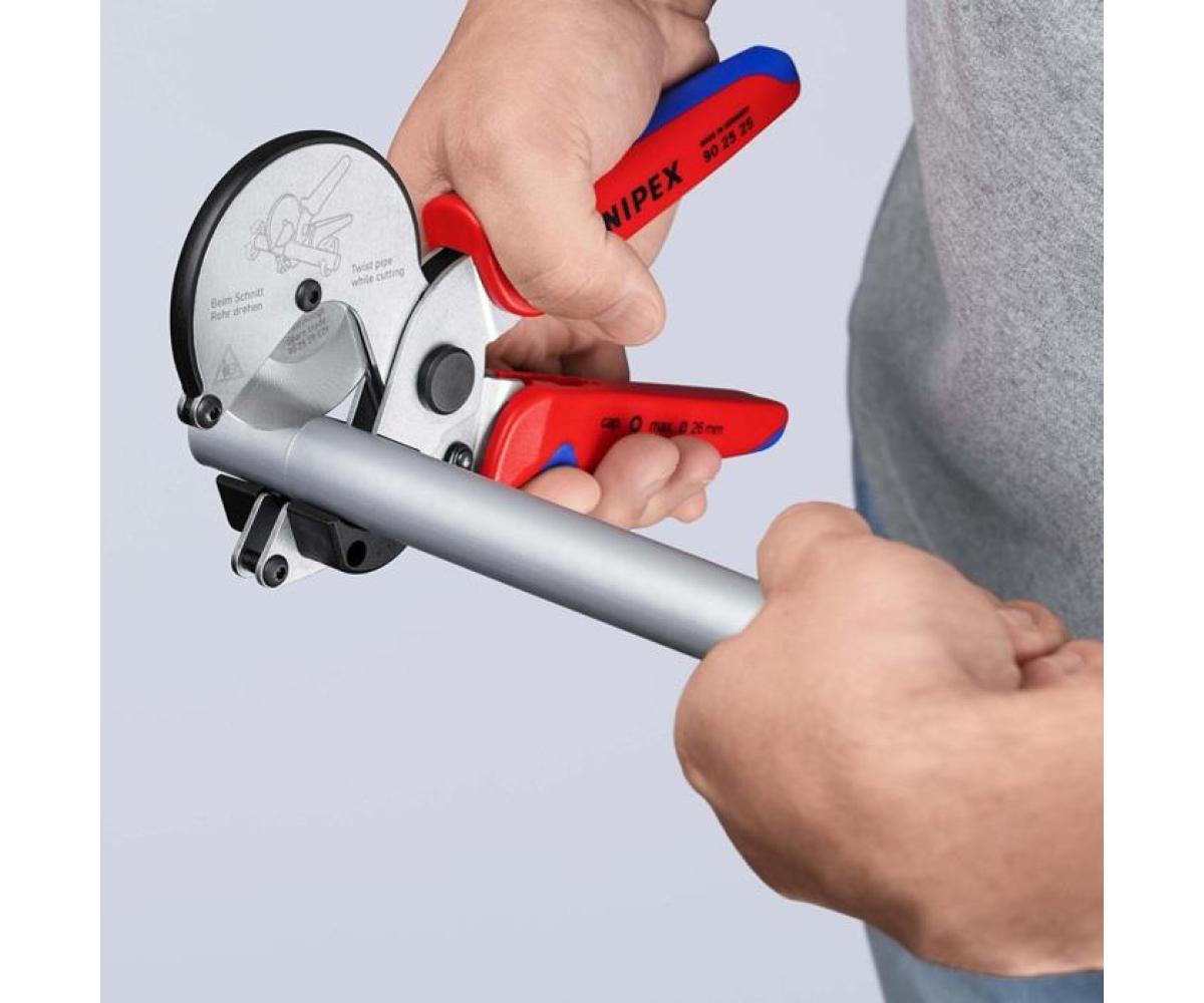 für Verbund- und Kunststoffrohre · frei drehbares Schneidrad für reibungsarmes Drehen des Rohrs · Rotationsbewegung ermöglicht müheloses Eindringen des Schneidrads bei minimierter Verformung des Rohrs · breite Kunststoff-Formauflagen für perfekt rechtwinklige Abschnitte · auch für Verbundrohre mit erhöhter Aluminiumschichtdicke (etwa Geberit Mepla) · mit Verschlussmechanismus Zange verzinkt · mit Mehrkomponenten-Hüllen