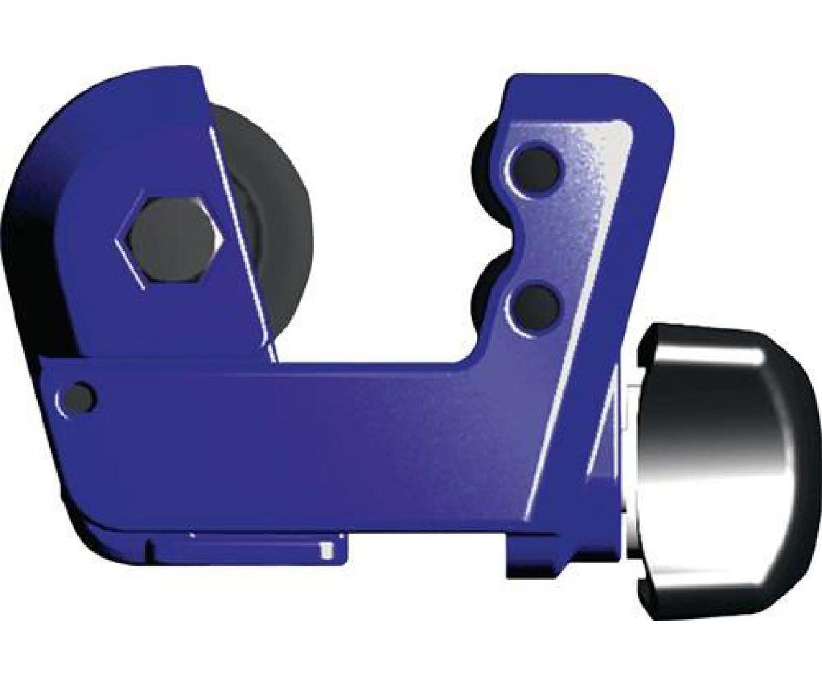 zum Schneiden von Aluminium, Kupfer und dünnwandigen Metallrohren · Körper, Schlitten und Drehknauf aus Zink-Druckguss · mit 1 Schneidrad · mit ICS-System · Schneidradwechsel ohne Werkzeug · mit stahlgelagerter Spindel · ergonoimscher Drehknauf · extrem reduzierter Arbeitsradius · Schneidrad aus DIN 100Cr6-Stahl, schwarz brüniert, Ø 19 mm · pulverbeschichtet