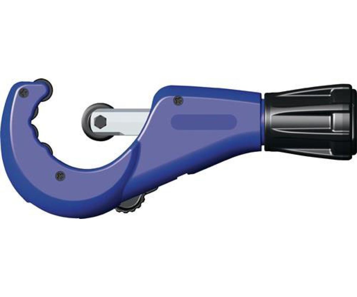 für dünnwandige Metallrohre aus AL, CU + INOX bis max. 2 mm · Körper aus Magnesium · Schlitten und Drehknauf aus Zink-Druckguss · mit stahlgelagerter Vorschub-Schnellspindel · Vierrollenführung · mit ausziehbarer NOGA-Entgrater-Klinge · Schneidrad aus DIN 100Cr6-Stahl, schwarz brüniert, Ø 19 mm · pulverbeschichtet · Schneidradwechsel ohne Werkzeug · Ersatzschneidrad im Drehknauf