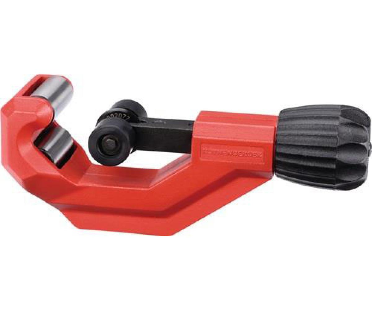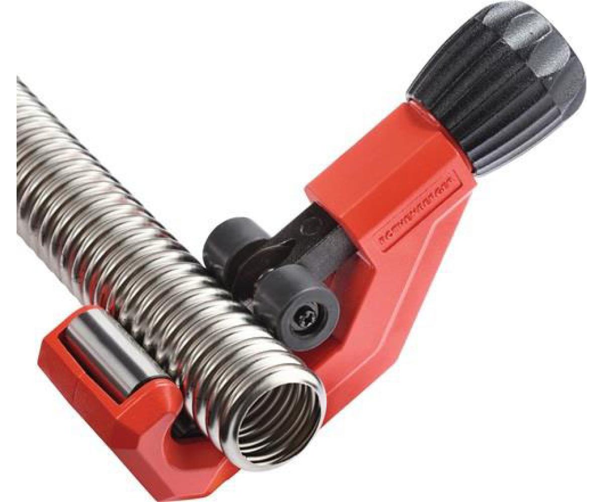 zum exakten Trennen von INOX-Wellrohren Ø 8 - 42 mm (3/8“ - 1.5/8”) mit einer Wandstärke von bis zu 0,2 mm · speziell ausgelegtes Schneidrad und Rohrführung für INOX-Wellrohr (CSST) · breite Auflagefläche für optimale Kraftverteilung und leichteres Schneiden · Ersatzschneidrad im Griff