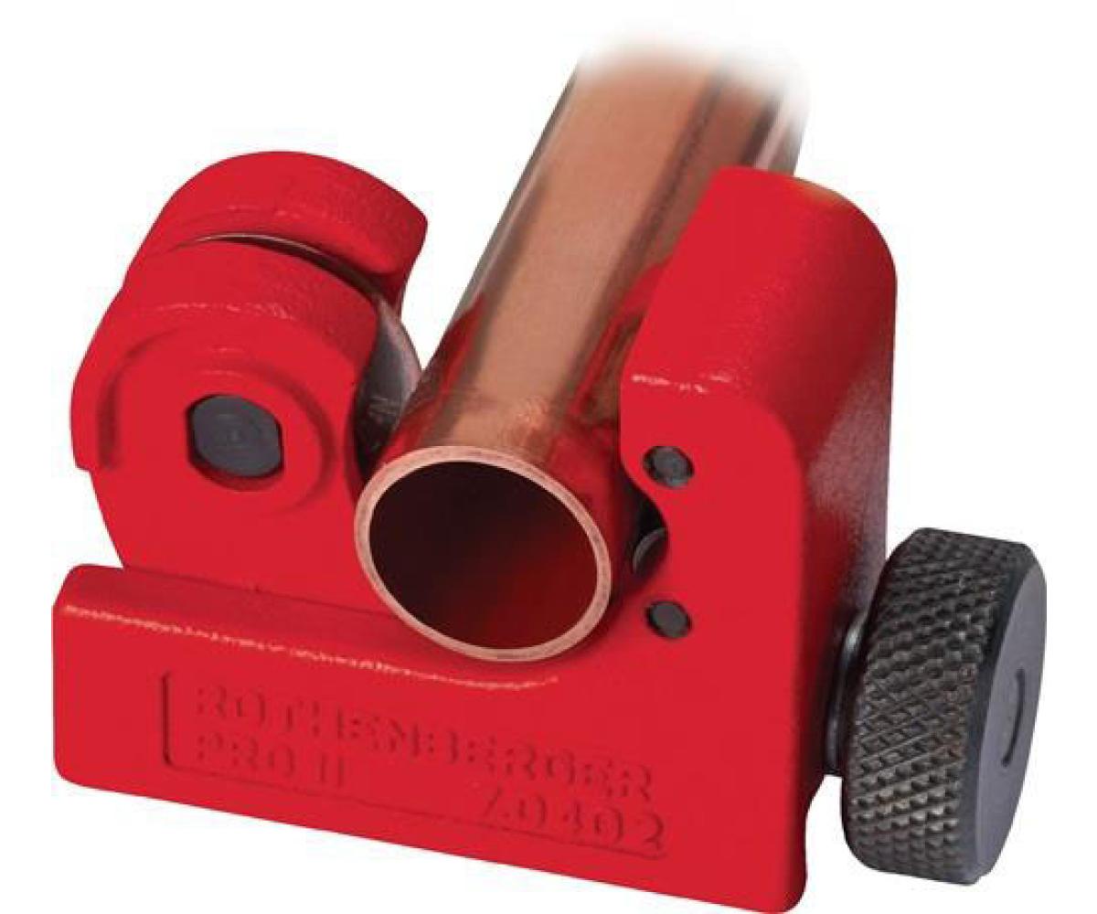 zum Schneiden von Kupfer-, Messing-, Aluminium- und dünnwandigen Stahlrohren · handliche Bauform mit sehr kleinem Arbeitsradius 38?mm (1.1/2?) bei I PRO oder 42?mm (1.1/4?) bei II PRO ermöglicht Arbeiten an schwer zugänglichen Stellen · mühelose Druckregulierung durch großen Rändelknopf und handliche Bauform · zwei Stützrollen mit Einstich für bördelnahen Schnitt · Monoblockbauweise ermöglicht Präzision im Zustellbereich