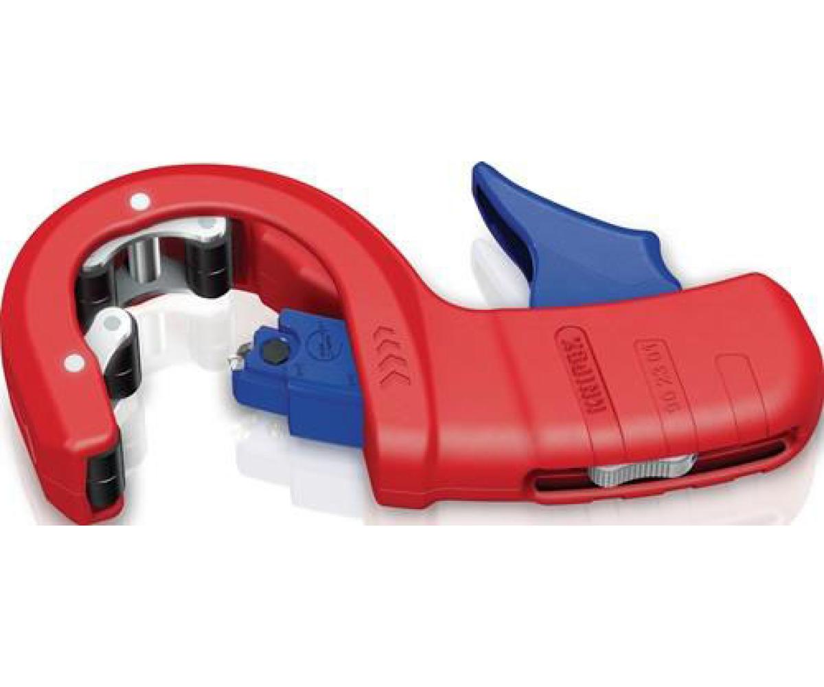 schneidet HT- und viele andere Kunststoffrohre mit Ø 32, 40 oder 50 mm und Wandstärken bis 2,4 mm · in einem Schritt bequem schneiden und anschrägen · abgefederte Schneidklinge: kein Nachstellen nötig, werkzeuglos wechselbare Wendeklinge aus hochwertigem Kugellagerstahl · Klinge nach Verschleiß werkzeuglos wendbar · leichtes Positionieren durch freien Blick auf die Trennstelle · Werkzeugkorpus aus glasfaserverstärktem Kunststoff
