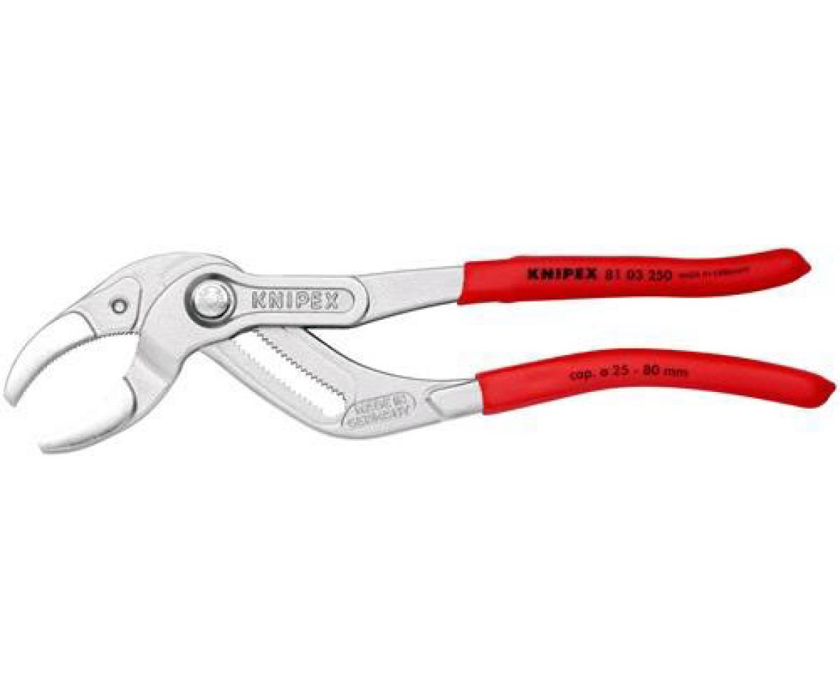 25-fach verstellbares, durchgestecktes Gelenk · Druckknopfverstellung · ergonomische Schenkelgeometrie · zum Anziehen und Lösen von Siphon-Verschraubungen, Kunststoff-Rohrverbindungen und runden Überwurfmuttern · Chrom-Vanadin-Elektrostahl, geschmiedet, ölgehärtet
