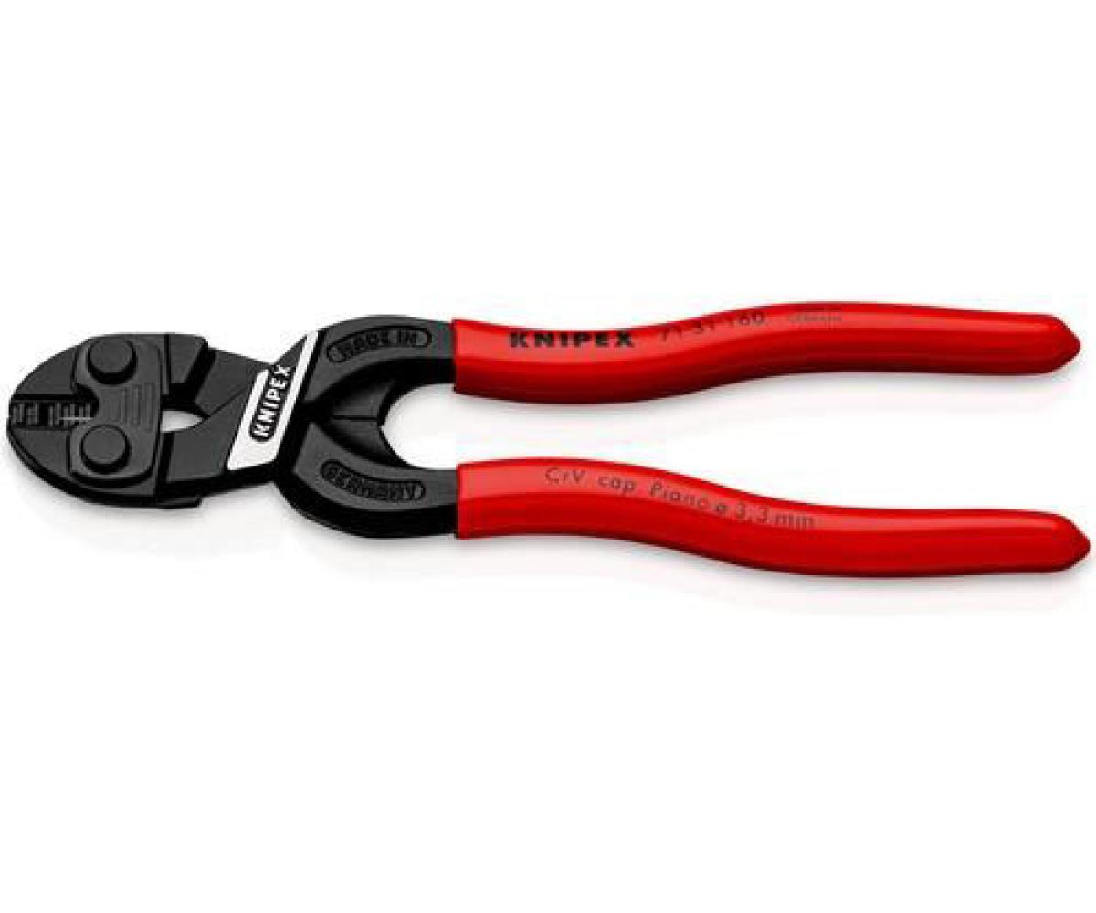 Weitere technische Eigenschaften · Material: Chrom-Vanadin-Elektrostahl · Norm: DIN ISO 5743 · Kompaktbolzenschneider · CoBolt® L.160mm · Ku.-Überzug ger.3,3mm · mit zusätzlicher Aussparung zur Schneiderleichterung bei dickeren Drähten z. B. bei abgehängten Deckenkonstruktionen Zange schwarz atramentiert ·