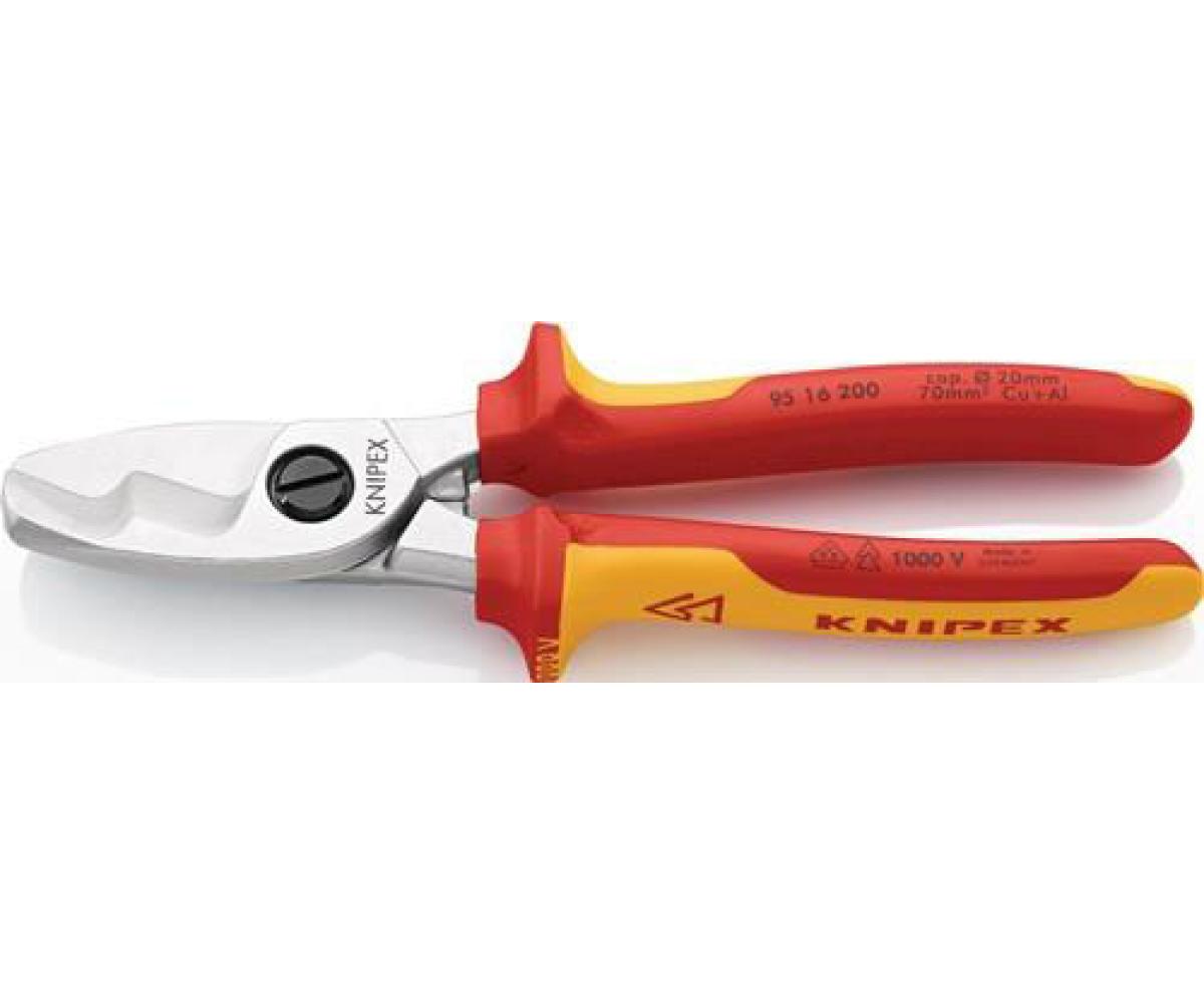 VDE-isoliert bis 1000 V · gefertigt gem. DIN EN/IEC 60900, stückgeprüft · mit Doppelschneide · für Kupfer-/Alukabel, ein- und mehrdrähtig · gehärtete Schneiden mit Präzisionsschliff · mit Vor- und Nachschnitt (1. und 2. Schneide) können Kabel bis 20 mm Ø in Einhandbetätigung getrennt werden · nicht für Stahldraht und hartgezogene Kupferleiter geeignet · Klemmschutz · Spezial-Werkzeugstahl in Sondergüte, geschmiedet, ölgehärtet Werkzeug verchromt