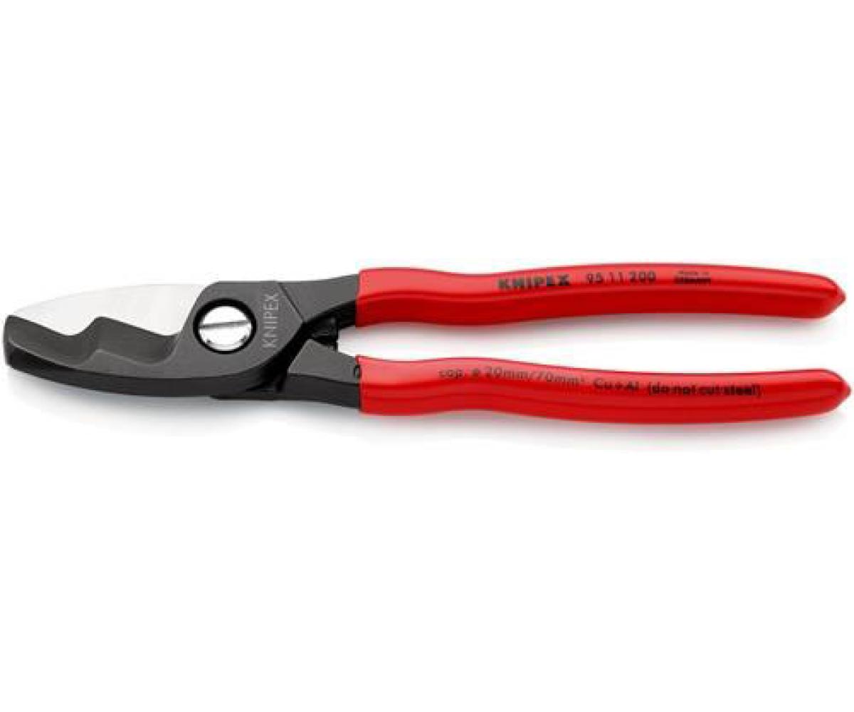 mit Doppelschneide · für Kupfer-/Alukabel, ein- und mehrdrähtig · gehärtete Schneiden mit Präzisionsschliff · mit Vor- und Nachschnitt (1. und 2. Schneide) können Kabel bis 20 mm Ø in Einhandbetätigung getrennt werden · nicht für Stahldraht und hartgezogene Kupferleiter geeignet · Klemmschutz · Spezial-Werkzeugstahl in Sondergüte, geschmiedet, ölgehärtet Werkzeug brüniert