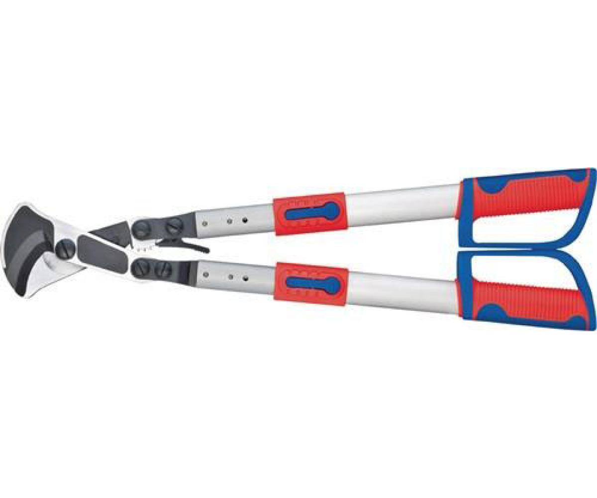 mit verstell- und abwinkelbaren Teleskopschenkeln · für Kabeldurchmesser bis 38 mm · auch geeignet zum Arbeiten in beengten Arbeitsbereichen · komfortables Arbeiten durch Ratschenprinzip und geringes Gewicht · ausziehbar bis auf 770 mm für maximalen Hebel bei großen Kabeldurchmessern · einschiebbar auf 570 mm für minimalen Platzbedarf beim Transport · auswechselbarer Schneidkopf · Schneidkopf: Spezial-Werkzeugstahl in Sondergüte, ölgehärtet
