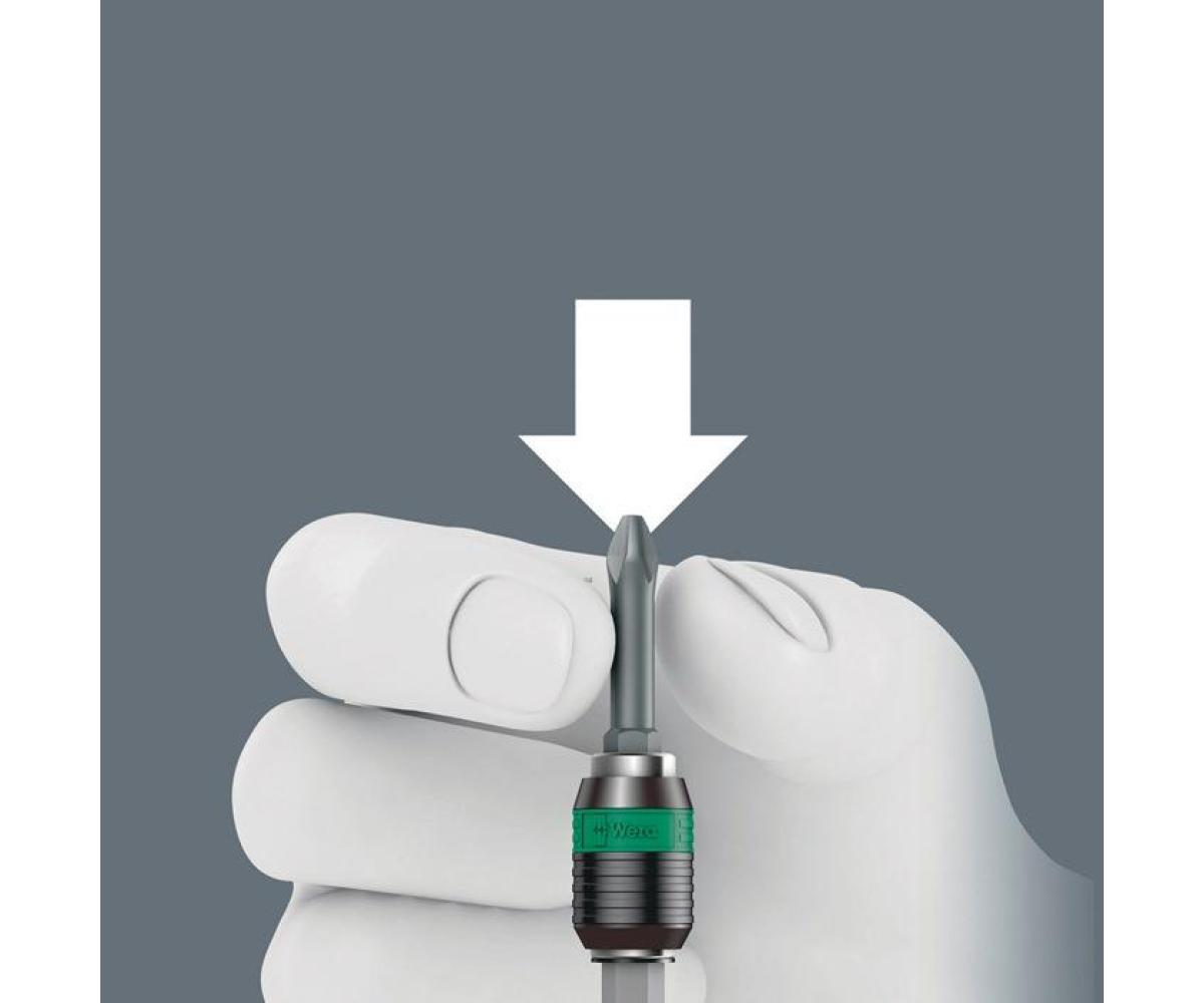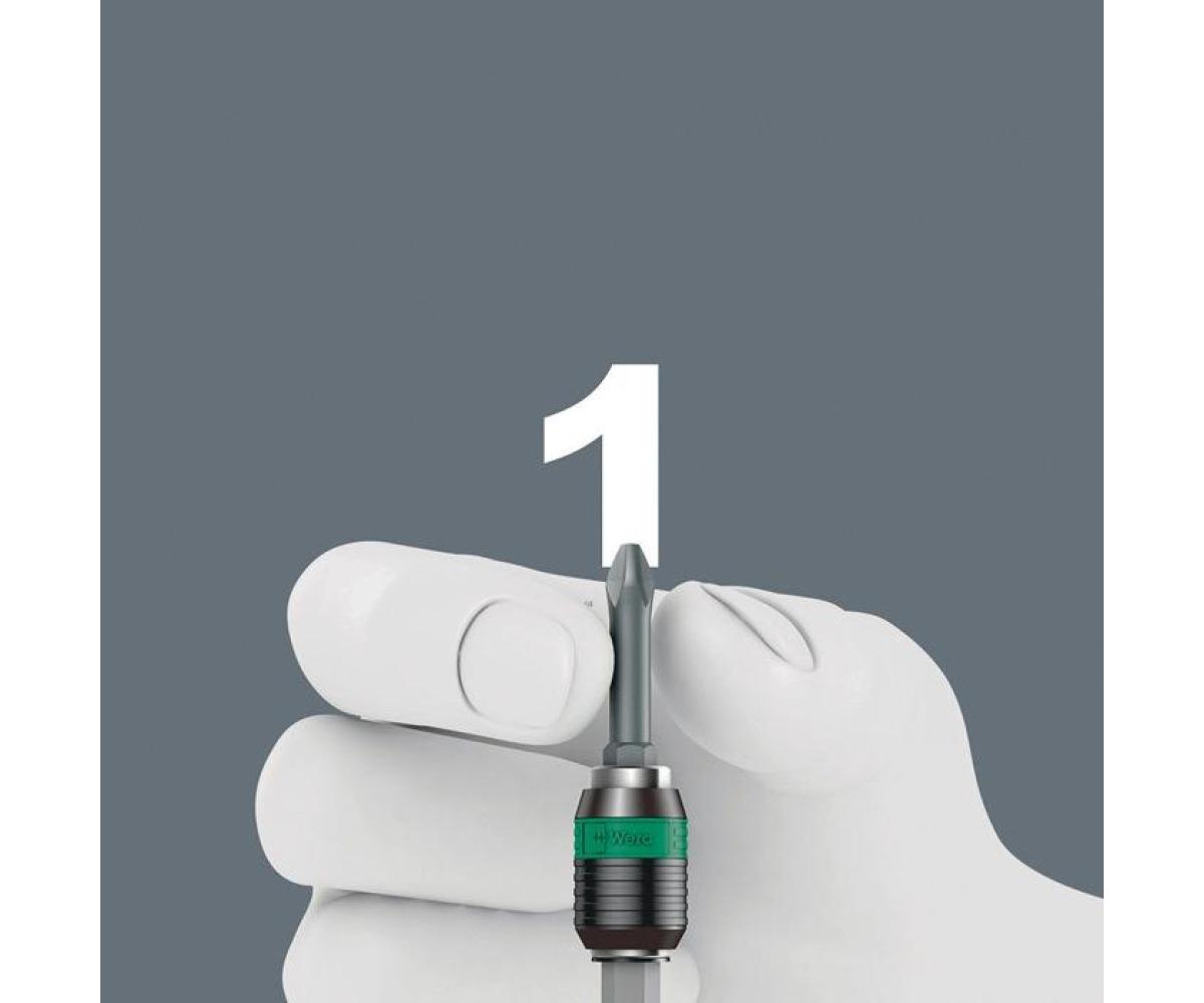 Rapidaptor Universalhalter für Bits mit 1/4"-Außensechskantantrieb nach DIN ISO 1173-C 6,3 und E 6,3 (ISO 1173) · Rapidaptor erlaubt eine Aufnahme der Bits auch ohne Betätigung der Hülse · die Entnahme des Bits geschieht durch einfaches Nach-vorn-Schieben - für blitzschnellen Bitwechsel, auch mit nur einer Hand · 1/4"-Sechskant, passend für Schraubermaschinen mit Aufnahme nach DIN ISO 1173-F 6,3