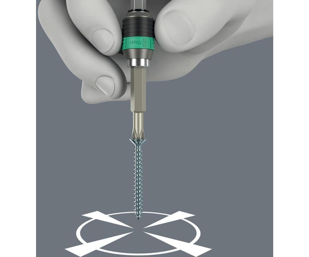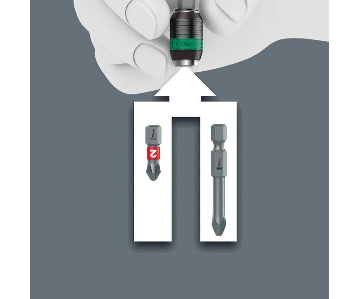 hochwertiger Bit-Handhalter · mit Ratschem Feinverzahnung für geringen Rückholwinkel, Umschaltring (rechts, fest, links) · maximales Drehmoment von bis zu 50 Newtonmetern · Schnellwechselfutter Rapidaptor ermöglicht blitzschnellen Bitwechsel ohne Hilfswerkzeug · starker Dauermagnet hält die Bits bombenfest · Kraftform Plus Griff für angenehm ergonomisches Arbeiten, bei dem Blasen und Schwielen vermieden werden · harte Griffzonen für hohe Arbeitsgeschwindigkeit, während weiche Griffzonen hohe Drehmomentübertragung garantieren · geeignet für Bits mit 1/4"-Außensechskantantrieb nach DIN ISO 1173-C 6,3 und E 6,3 (ISO 1173)