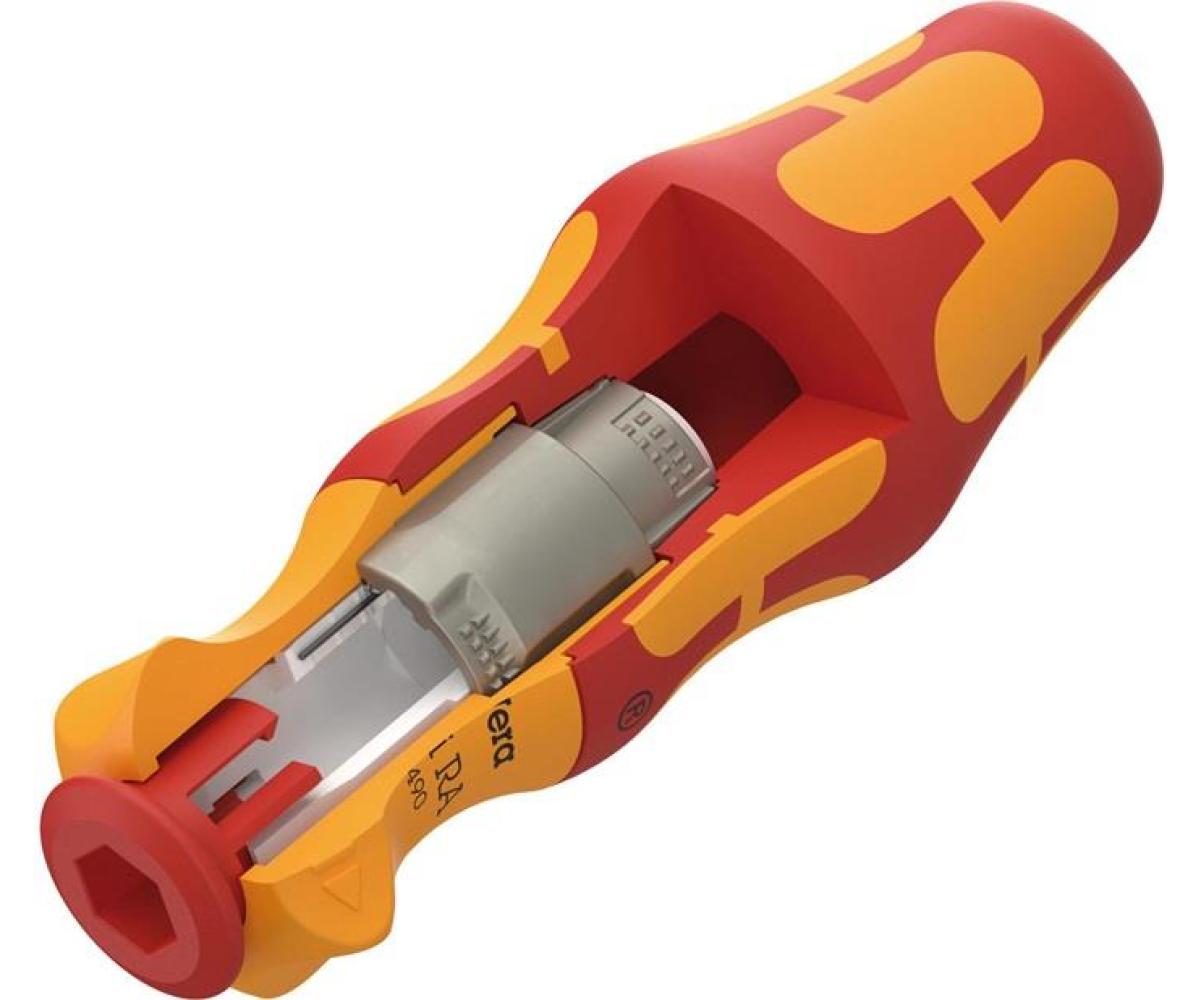Kraftform Kompakt VDE Handhalter mit Ratschenfunktion · die integrierte Ratsche mit Feinverzahnung sorgt für schnelles und sicheres Arbeiten · hohe Arbeitsgeschwindigkeit: Mit der Ratsche kann beim Verschrauben auch "gezwirbelt" werden · ergonomisches intuitives Umschalten auf Rechts-/Links- oder 0-Position · Kraftform Plus Griff für angenehmes ergonomisches Arbeiten · harte Griffzonen für hohe Arbeitsgeschwindigkeit, weiche Griffzonen für hohe Drehmomentübertragung · mit Sechskantabrollschutz gegen Wegrollen · ausschließlich für Wera VDE-Wechselklingen