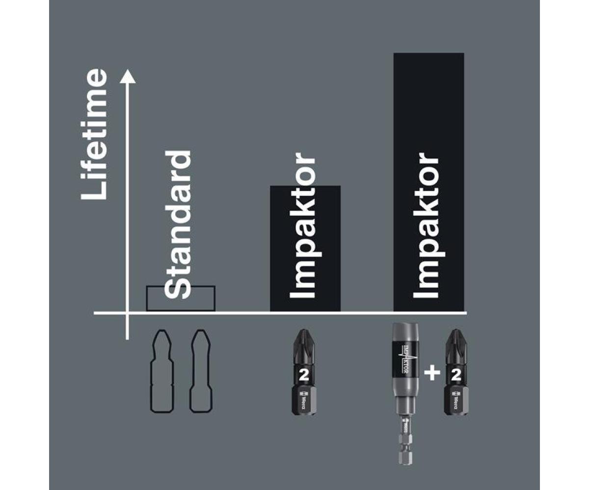 Hochwertige Bits für Pozidriv*-Schrauben. Die Impaktortechnologie sorgt für überdurchschnittliche Standzeiten auch bei extremen Anforderungen. Erhöhter Reibungswiderstand durch raue Diamantpartikelbeschichtung auf der Bitspitze verhindern das Herausrutschen aus der Schraube. Besonders geeignet für den Einsatz mit handelsüblichen Impakt-/Schlagschraubern. 1/4"-Sechskant · passend für Halter nach DIN ISO 1173-D 6,3. * Pozidriv = eingetragenes Warenzeichen der Firma European Industrial Service Ltd.