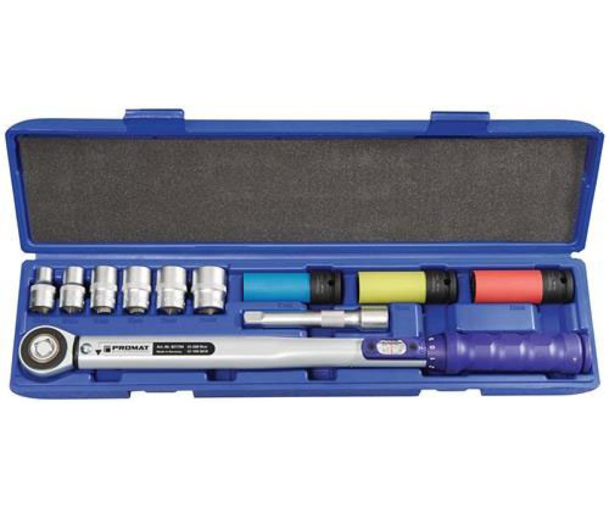 (Radmontageset) Inhalt: 1 Drehmomentschlüssel mit 12,5 mm (1/2") 1 Durchsteckvierkant 12,5 mm (1/2") je 1 6-kant Steckschlüsseleinsatz 12,5 mm (1/2") SW 10 / 13 / 17 / 19 / 21 / 24 mm* je 1 6-kant Steckschlüsseleinsatz 78 mm lang 12,5 mm (1/2") SW 17 / 19 / 21 mm** 1 Verlängerung 12,5 mm (1/2") 125 mm lang* * für Handbetätigung **mit Kunststoffhülse – verhindert eine Beschädigung von empfindlichen Aluminium-Oberflächen (auch geeignet für Druckluftschlagschrauber) Drehomentschlüssel automatisch auslösend · für den kontrollierten Rechts- und Linksanzug · integrierte Knarrenfunktion · fühlbares und akustisches Auslösesignal · Doppelskala (Nm/lbf.ft.) unter einem Sichtfenster mit Lupeneffekt · Auslösegenauigkeit ± 3 % Toleranz vom eingestellten Skalenwert