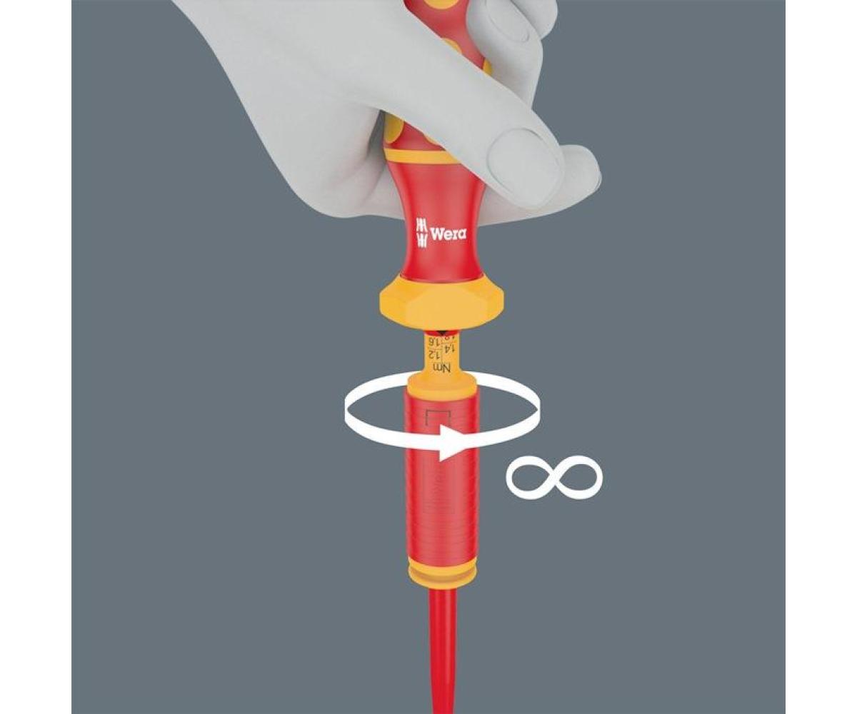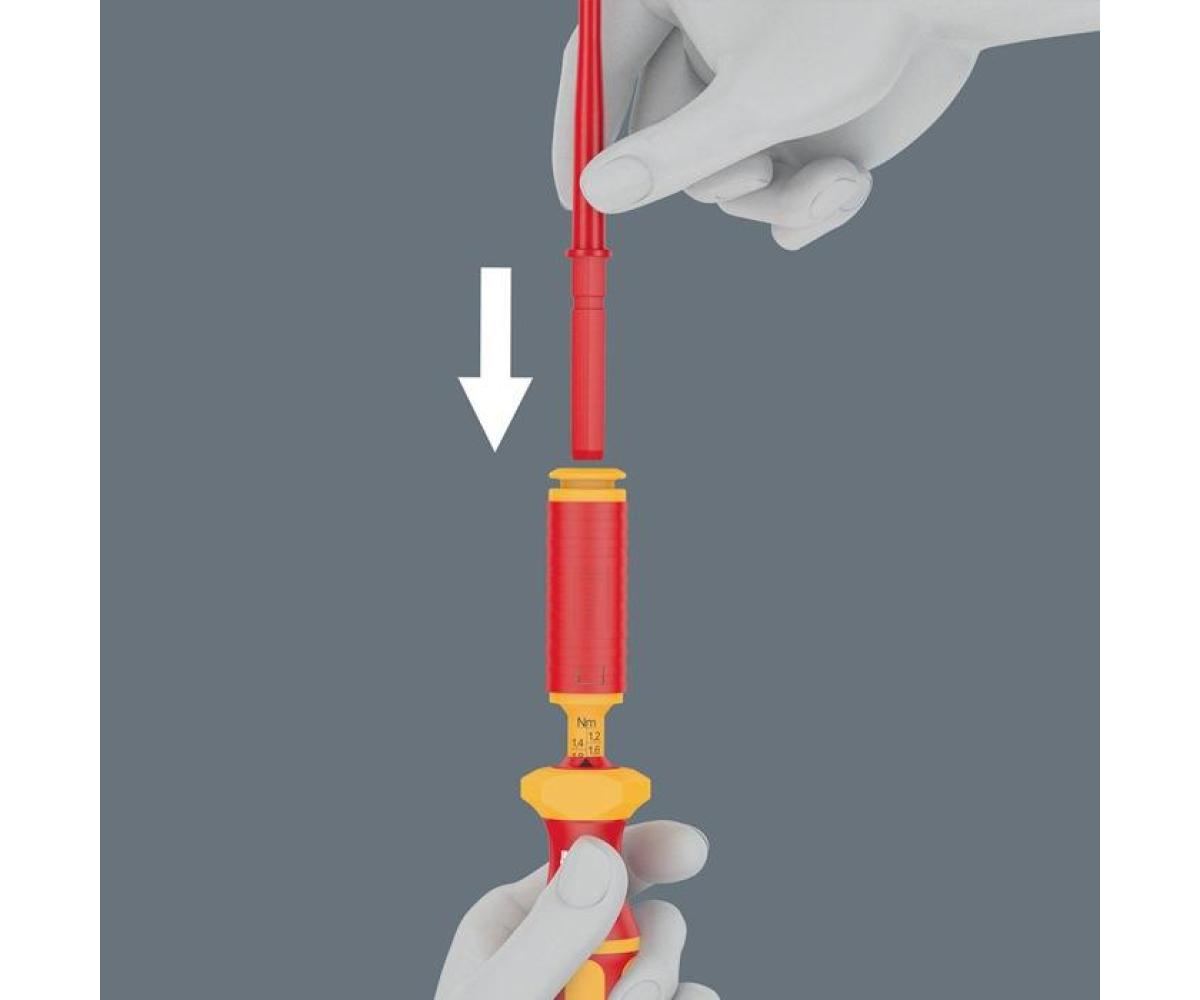 Drehmoment-VDE-Handhalter für sicheres Arbeiten bis 1000 Volt. Mit einstellbarem Drehmoment von 0,3-1,2 Nm. Deutlich hör- und spürbares Überrasten beim Erreichen des eingestellten Drehmoments. Unbegrenztes manuelles Lösemoment. Für Kraftform Kompakt VDE-Klingen: Das Griff-/Wechselklingen-System lässt blitzschnellen Austausch der benötigten Klinge und damit vielfältige Anwendungen zu.