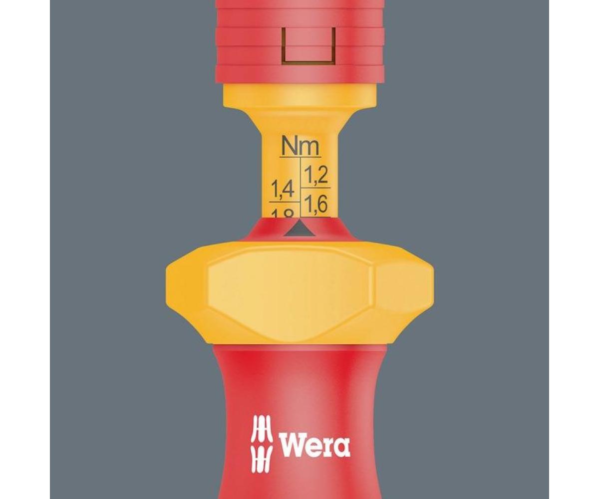 Weitere technische Eigenschaften · prüfpflichtig: ja · Abrollschutz: ja · Aufnahmegröße: 9,0mm · Einstellbar: ja · GS - Geprüfte Sicherheit: ja · Länge Drehmomentschlüssel (in Zoll): 7 9/16"Zoll · Torque: ja · Drehmomentschraubendreher · 7400 VDE 0,3-1,2 Nm · 6-kant-Aufnhame 9mm WERA ·