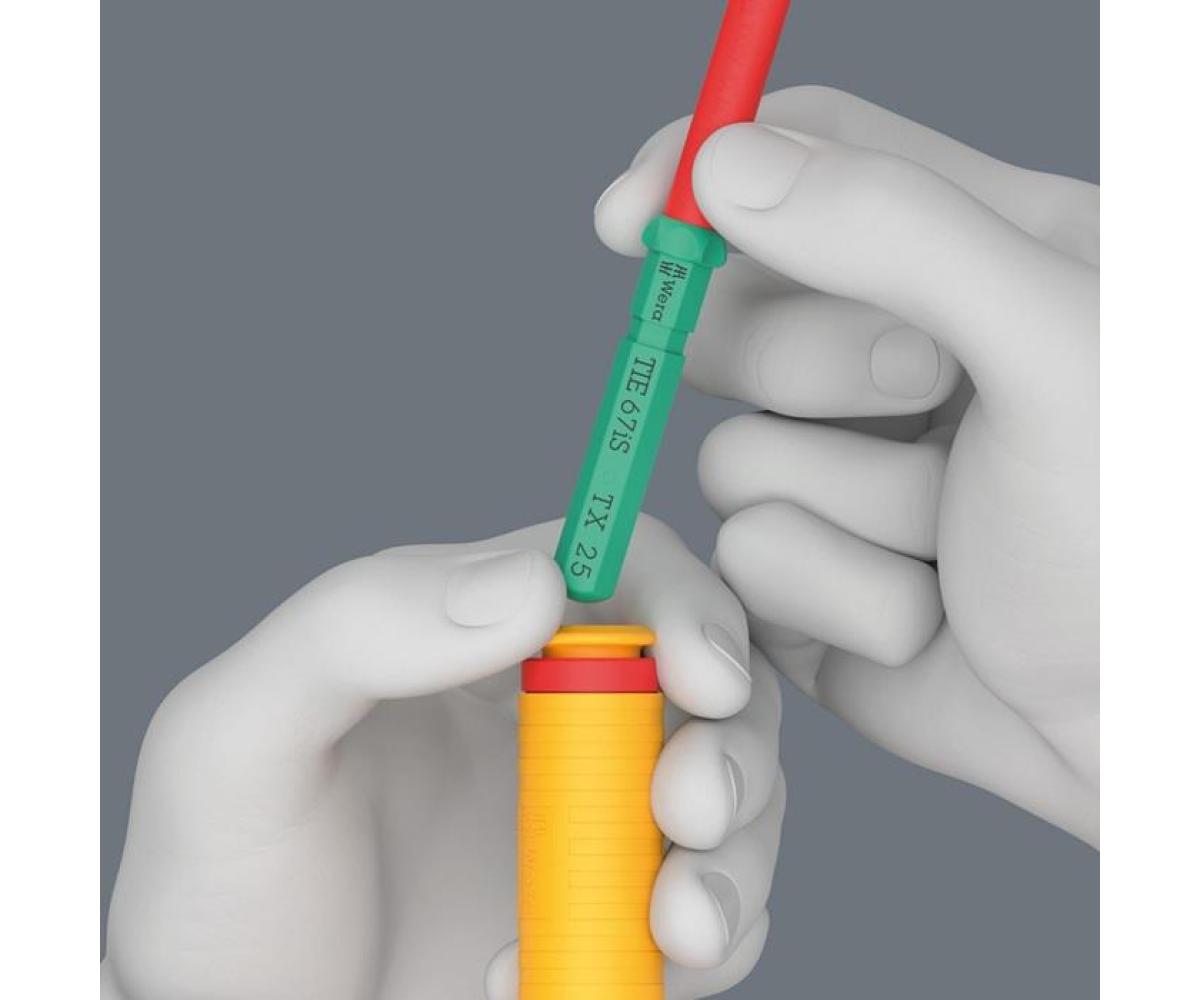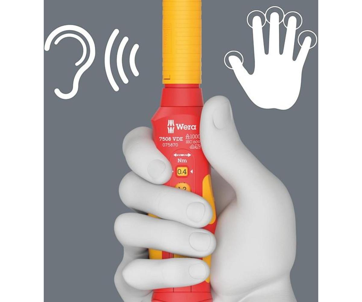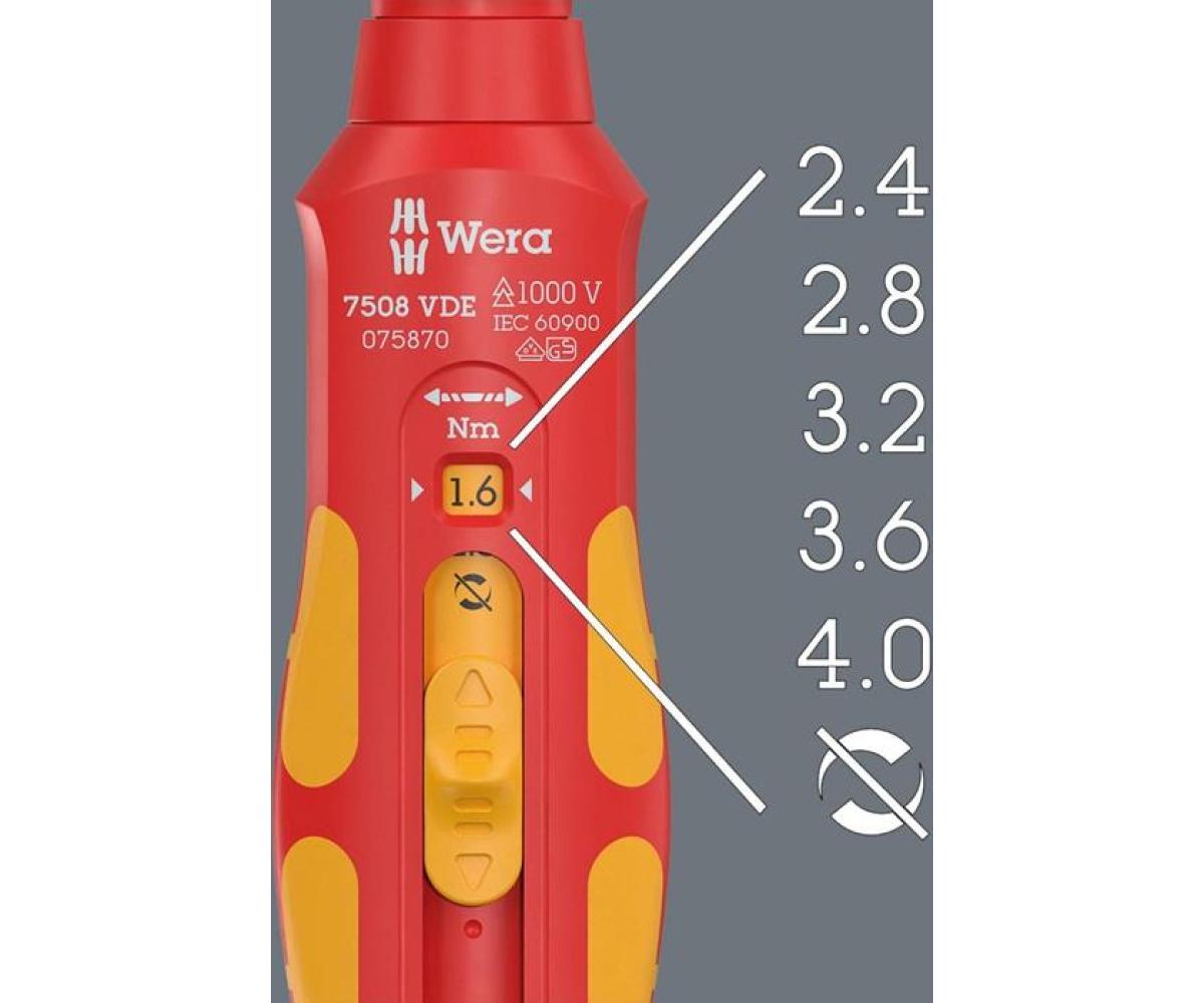 VDE-isolierter Drehmomentschraubendrehergriff mit 9 mm Sechskantaufnahme · ausschließlich für Wera Kraftform Kompakt VDE Wechselklingen · für professionelles Schrauben/Feinjustage UND für drehmomentkontrolliertes Schrauben · Überrutschende, nicht überziehbare Drehmomentfunktion für Rechts-/ Linksanzug · mit fünf wählbaren Anzugsdrehmomenten Rechts/Links (Art.-Nr. 8004 994 758: 0,4 · 0,8 · 1,2 · 1,6 · 2,0 Nm bzw. Art.-Nr. 8004 994 759: 2,4 · 2,8 · 3,2 · 3,6 · 4,0 Nm), die extrem schnell eingestellt werden können · eine Fest-Stellung (Torque Lock) für unbegrenzte Löse-/Anzugsmomente · mit Freilaufhülse für eine gute Führung des Werkzeugs während des Schraubvorgangs