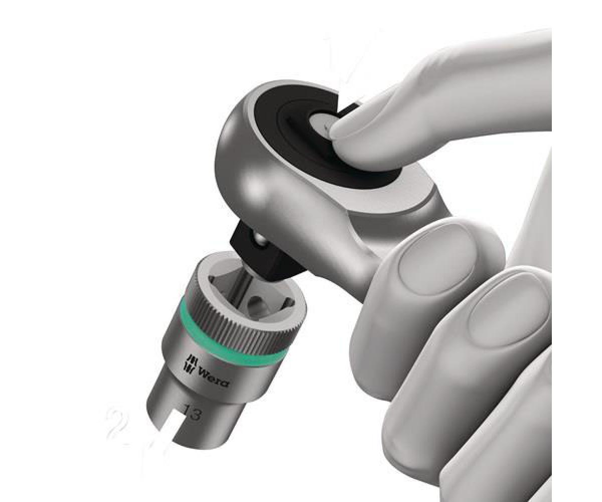 10,0 mm (3/8 ?)-Vierkantantrieb · robuste, feinverzahnte, geschmiedete Vollmetallknarre · aus legiertem Werkzeugstahl · matt verchromt · mit unverlierbarem Durchsteckvierkant und Nussverriegelungsfunktion · schlanke Bauform · langer Hebel · Rückschwenkwinkel nur 4,7° · (optimal geeignet auch für sehr beengte Arbeitsräume)