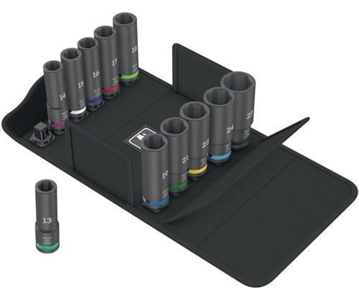 12,5 mm (1/2")-Vierkantantrieb · 6-kant · lange Ausführung · Steckschlüssel-Einsätze mit Farbleitsystem · Chrom-Molybdän Stahl · Oberfläche matt-schwarz für den Einsatz mit Elektro- oder Druckluft-Schlagschraubern Inhalt: je 1 Kraftschrauber-Einsatz Gr. 13 / 14 / 15 / 16 / 17 / 18 / 19 / 21 / 22 / 24 / 27 mm (Länge 83 mm)