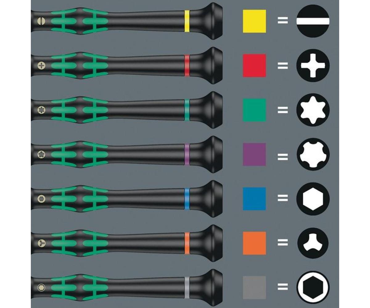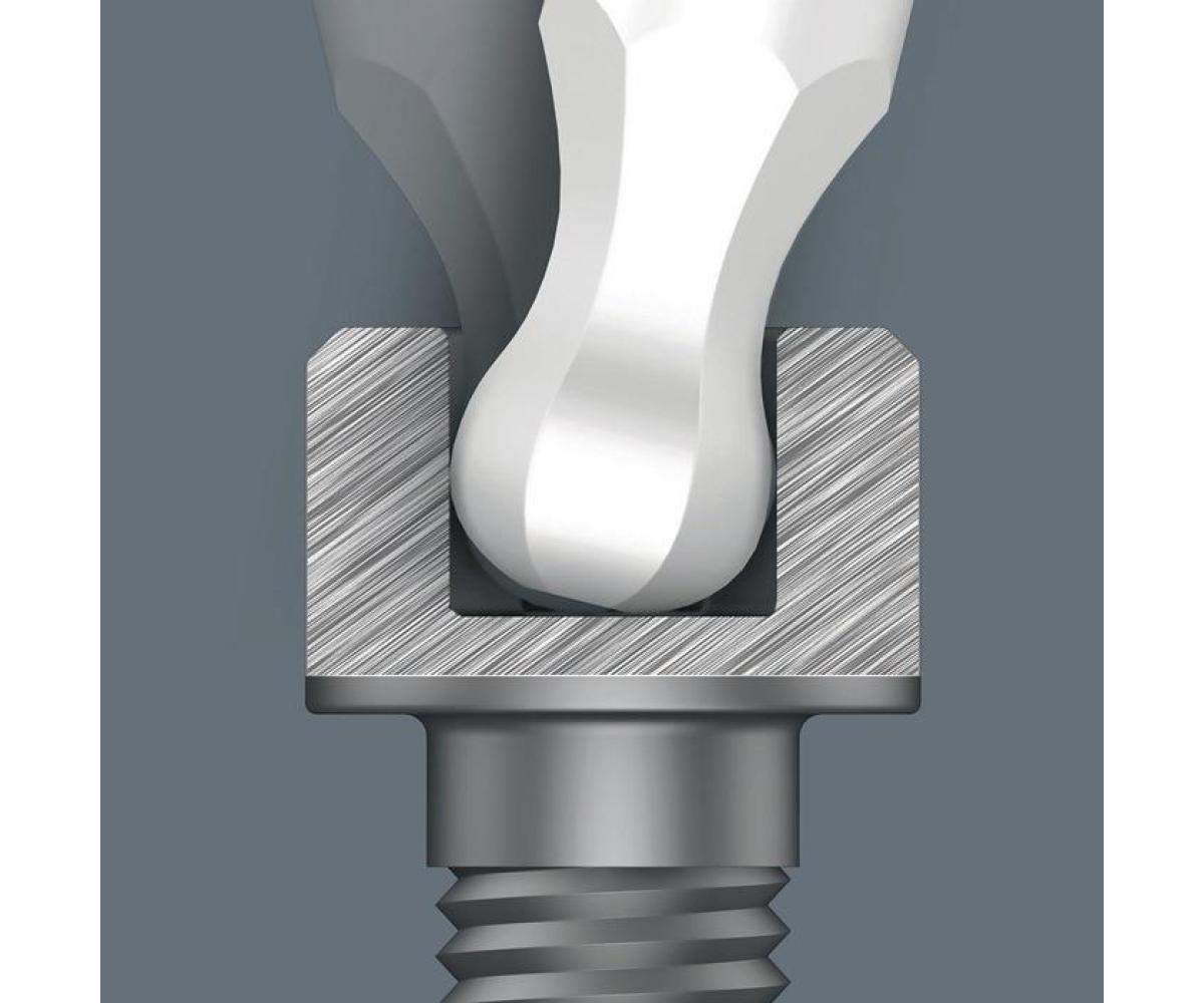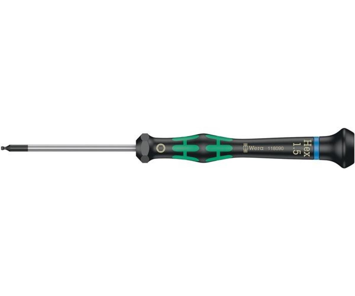 hochwertiger Micro Schraubendreher für feinmechanische Verschraubungen · Sechskant Kugelkopf · Kugelkopfprofil: kugelförmigen Abtriebsprofil - Auslenken oder Schwenken der Werkzeugachse zur Schraubenachse möglich - mögliches "um die Ecke"-Schrauben · durch Abstützen der Hand auf der Drehkappe und durch die Schnelldrehzone unterhalb der Drehkappe ist blitzschnelles Zwirbeln möglich - zeitintensives Umgreifen entfällt · Kraftzone mit integrierten Weichzonen für die Übertragung hoher Löse- und Anzugsmomente · Präzisionszone für den richtigen Drehwinkel bei Justierarbeiten ·Wera Black Point-Spitze bietet Passgenauigkeit und optimierten Korrosionsschutz · Take it easy Werkzeugfinder mit Farbkennzeichnung nach Profilen und Größenstempelung - zum einfachen und schnellen Finden des benötigten Werkzeugs
