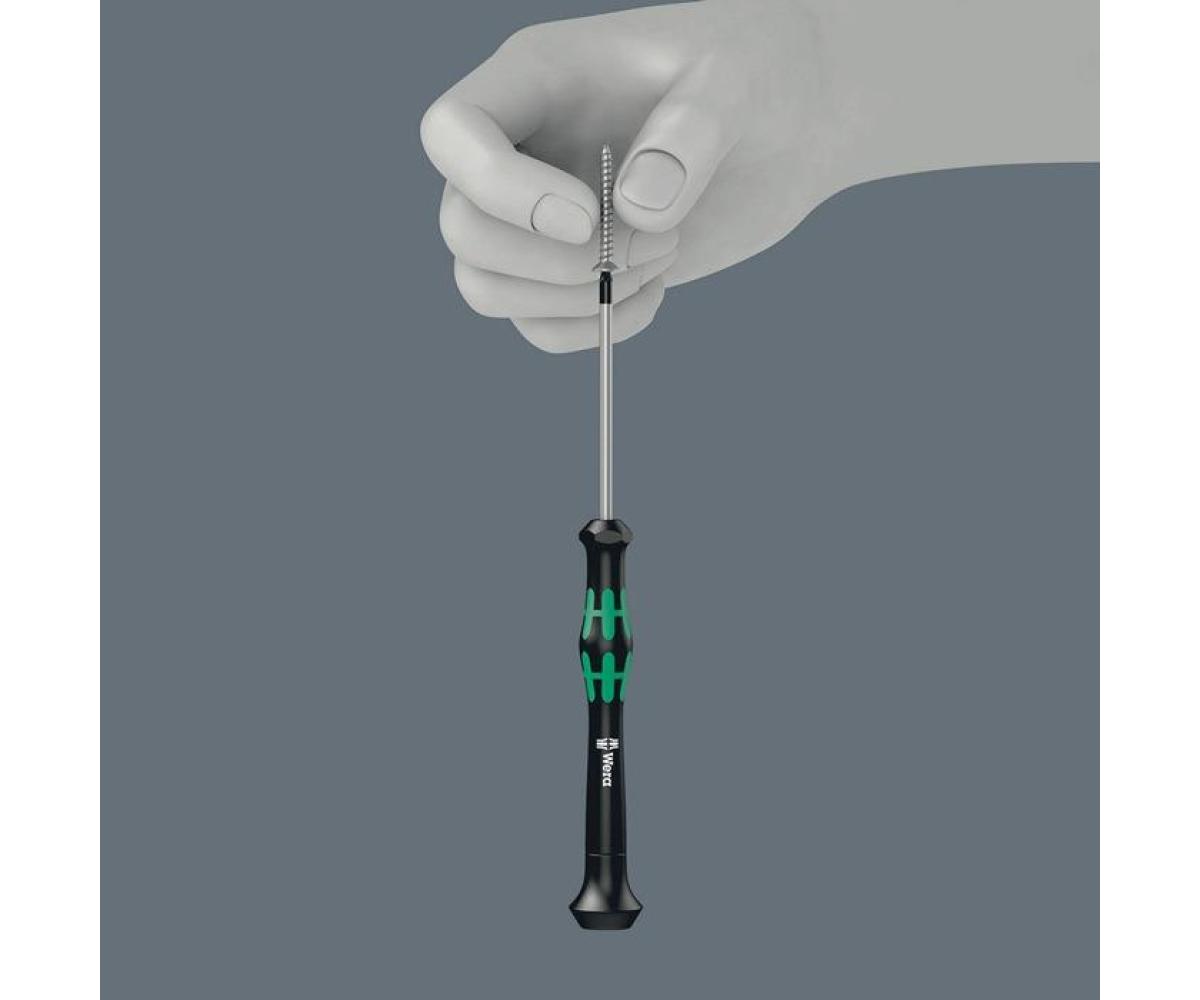 hochwertiger Wera Micro Schraubendreher für feinmechanische Verschraubungen · mit praktischer Haltefunktion: Durch die aus der Flächenpressung zwischen der Abtriebsspitze und Schraubenprofil resultierende Klemmkraft werden die Schrauben sicher auf dem Werkzeug gehalten · durch Abstützen der Hand auf der Drehkappe und durch die Schnelldrehzone unterhalb der Drehkappe ist blitzschnelles Zwirbeln möglich - zeitintensives Umgreifen entfällt · Kraftzone mit integrierten Weichzonen sorgt für die Übertragung hoher Löse- und Anzugsmomente · Präzisionszone für den richtigen Drehwinkel bei Justierarbeiten · Black Point-Spitze bietet Passgenauigkeit und optimierten Korrosionsschutz · Take it easy Werkzeugfinder mit Farbkennzeichnung nach Profilen und Größenstempelung - zum einfachen und schnellen Finden des benötigten Werkzeugs