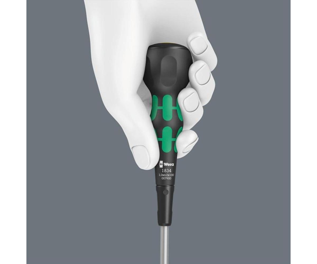 Weitere technische Eigenschaften · Klingen-Ø: 6mm · Schneidenstärke: 1mm · Abrollschutz: ja · Gesamtlänge Klinge: 150mm · Gesamtlänge Klinge in Zoll: 6"Zoll · Grifflänge: 135mm · Klingenbreite (in Zoll): 1/4"Zoll · Klingenlänge (in Zoll): 4 23/32"Zoll · Kraftform Griff: ja · Lasertip: ja · Take it Easy Kraftform Schraubendreher: ja · Schraubendreher 1834 6mm · Klingen-L.120mm WERA ·