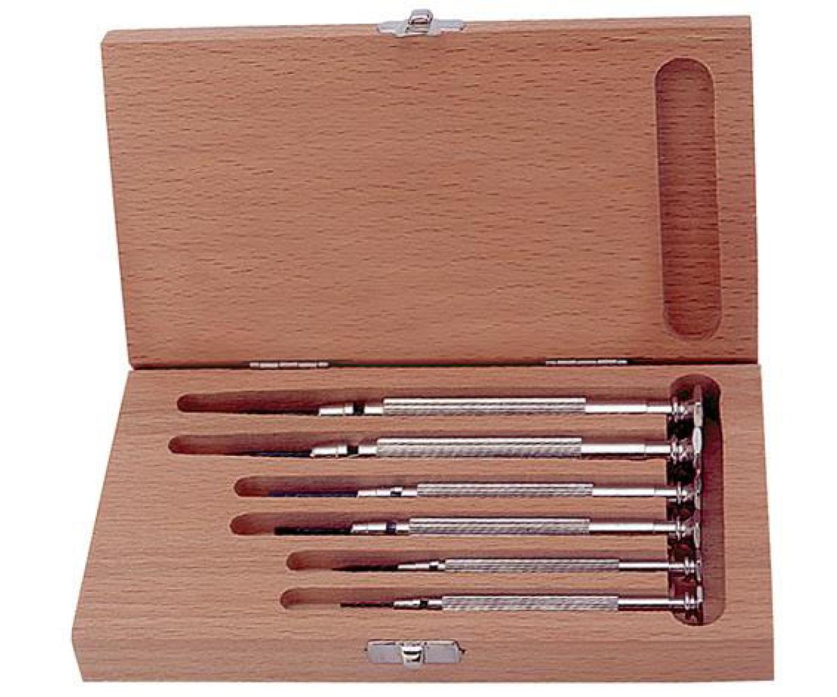 Weitere technische Eigenschaften · Verpackung: im Holzkasten · Feinmechanikerschraubendr · ehersatz 250 · 6tlg.Schlitz/PH TURNUS ·