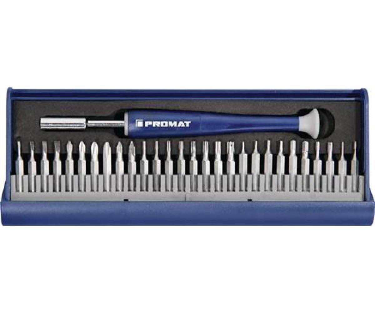 Handgriff mit magnetischem Bithalter und drehbarem Kopf · komplett mit 28 Mikro-Bits Inhalt: 1 Handgriff mit je 1 Mikro-Bit für Schlitzschrauben Gr. 1,5 / 2,0 / 2,5 / 3,0 mm je 1 Mikro-Bit für Schrauben mit Kreuzschlitz (PH) Gr. 00 / 0 / 1 / 2 je 1 Mikro-Bit für Schrauben mit Kreuzschlitz (PZD) Gr. 0 / 1 je 1 Mikro-Bit (mit Bohrung) für Schrauben mit TORX®-Profil (auch mit Sicherungsstift) Gr. T 4 / 5 / 6 / 7 / 8 / 9 / 10 / 15 je 1 Mikro-Bit für Schrauben mit Innensechskant-Profil Gr. 0,9 / 1,3 / 1,5 / 2,0 / 2,5 / 3,0 mm je 1 Mikro-Bit für Schrauben mit TRI-WING®-Profil Gr. 1,5 / 2,0 mm je 1 Mikro-Bit für Schrauben mit Five Lobe-Profil Gr. 1 / 1,5 mm Unter anderen optimal geeignet für die Reparatur von Mobiltelefonen