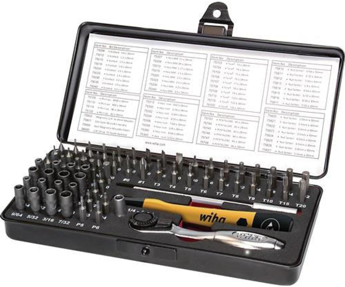 für alle Micro-Verschraubungen im Bereich Feinmechanik, Elektronik und Modellbau · komplett mit ESD Feinschraub-Griff und Bit Ratsche · der ESD-Feinschraubgriff ist gefertigt gemäß IEC 61340-5-1 · (mit einem Oberflächenwiderstand von 106 - 109 Ohm leitet er elektrostatische Energie kontrolliert und sicher ab) Inhalt: 1 ESD Feinschraub-Griff (Bitaufnahme geeignet nur für 4 mm slimBits) 1 feinverzahnte Bitknarre (72 Zähne) mit Daumenrad, Links-/Rechts umschaltbar für Bits 6,3 mm (1/4)", Form C 6,3 und E 6,3 je 1 Micro Bit für Schlitzschrauben 0,8 / 1,2 / 1,5 / 1,8 / 2,0 / 2,5 / 3,0 / 3,5 / 4,0 mm* je 1 Micro Bit für Schrauben mit Innensechskant-Profil Gr. 0,7 / 0,9 / 1,3 / 1,5 / 2,0 / 2,5 / 3,0 mm / 5/32 Zoll je 1 Micro Bit für Schrauben mit Innensechskant-Profil Gr. 1/16 - 5/64 - 3/32 - 5/32 - 7/64 - 1/8 - 9/64 Zoll je 1 Micro Bit für Schrauben mit Innen-TORX®-Profil Gr. T 3 / 4 / 5 / 6 / 7 / 8 / 9 / 10 / 15 / 20 je 1 Micro Bit für Schrauben mit Pentalobe Profil Gr. PL 1 / 2 / 3 / 4 / 5 / 6 je 1 Micro Bit für Schrauben mit Kreuzschlitz Gr. PH 000 / 00 / 0 / 1 je 1 Micro Steckschlüssel für Schrauben mit Außen-Sechskant-Profil Gr. 2 / 2,5 / 3 / 3,5 / 4 / 4,5 / 5 / 5,5 mm** je 1 Micro Steckschlüssel für Schrauben mit Außen-Sechskant-Profil Gr. 5/64 - 3/32 - 7/64 -1/8 - 9/64 - 5/32 - 3/16 - 7/32 Zoll** 1 Adapter mit Magnet (ermöglicht die Anwendung der MicroBits in allen "normalen" Bithaltern für C 6,3 Bits) * Länge 28 mm ** Länge 30 mm